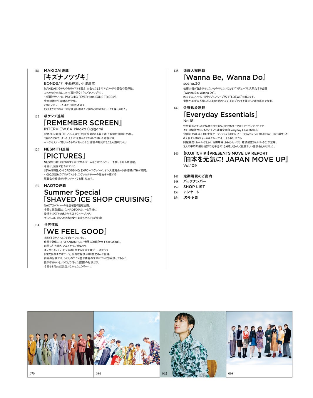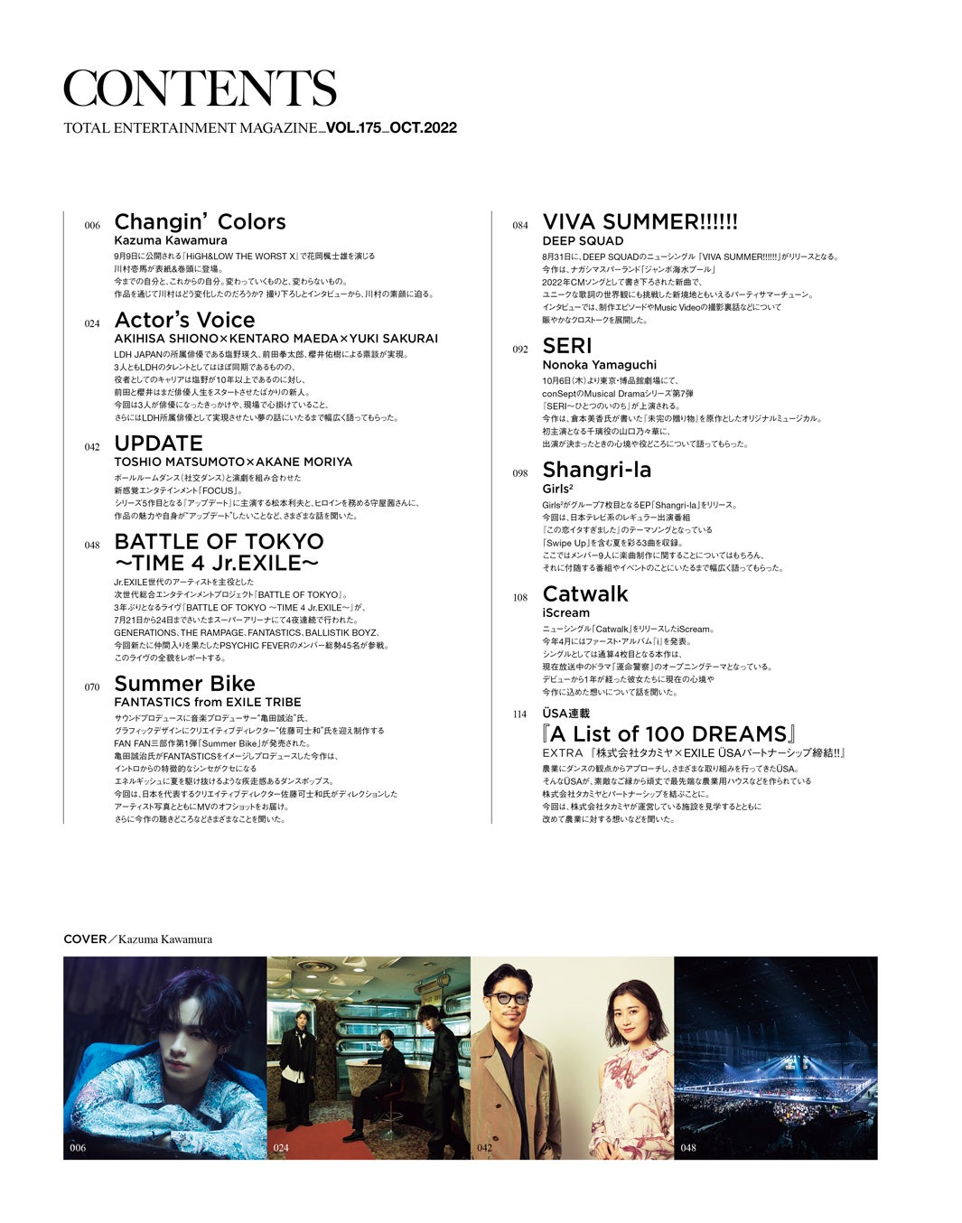 その他の特集では、LDH JAPANの所属俳優である塩野瑛久、前田拳太郎、櫻井佑樹による鼎談が実現。3人ともLDHのタレントとしてはほぼ同期であるものの、役者としてのキャリアは塩野が10年以上であるのに対し、前田と櫻井はまだ俳優人生をスタートさせたばかりの新人。今回は3人が俳優になったきっかけや、現場で心掛けていること、さらにはLDH所属俳優として実現させたい夢の話にいたるまで幅広く語った。そのほか、舞台FOCUS2022『アップデート』で主演の松本利夫とヒロインを務める守屋茜との対談企画や、7月に行われた『BATTLE OF TOKYO ~TIME 4 Jr.EXILE~』ライヴレポートなど、今号も充実した内容になっている。(modelpress編集部)