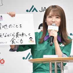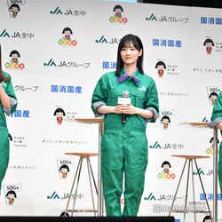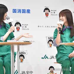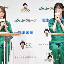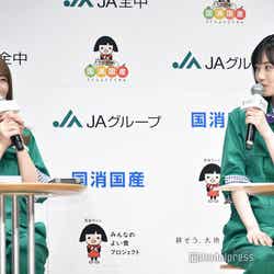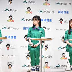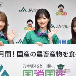 乃木坂46の秋元真夏、山下美月、与田祐希が3日、都内で行われた記者会見に出席。つなぎ姿で登場し、「国消国産」をアピールした。