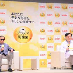 免疫ケアについて、タモリは「コマーシャルをやっているだけあって、色んな知り合いから聞かれます。特に僕らの年代は相当関心を持っているのがわかります。中には『何をやってもダメだろ』というヤツもいますが」とブラックジョークを交えながら周囲の反響を伝えた。また、自身も健康を意識するようになったそうで、「いい機会で、色々お話を伺ったりして、免疫ケアは大事だなと思いますね。今、簡単になりましたからね」と話すと、「(企業から商品を)大量にいただいておりますので毎日摂るようにしています。有り難いです」と感謝。続けて「そろそろなくなるようです」とアピールし、会場の笑いを誘った。