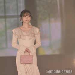 鈴木は「dazzlin」のステージに、美しいデコルテラインが際立つフリルの襟が付いたロングワンピースで登場。タイトなニット素材ですらっとした抜群のスタイルを披露し、トップではバッグを顔のそばに持って困ったような“あざと可愛い”表情も見せた。