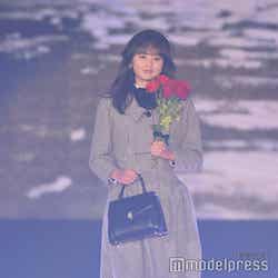 ファッションブランド「F i.n.t」のステージに登場した遠藤は、千鳥格子のセットアップにベレー帽を合わせ、優しい笑みを浮かべてランウェイ。トップでは、真っ赤なバラを顔の前に持ち、ちらりと覗く可愛らしい仕草で観客を釘付けにした。
