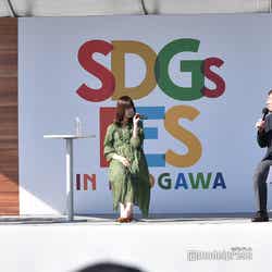 柄ベストを合わせた秋のコーディネートを着こなしたトラウデン直美は、SDGsトークステージに登場。実際にSDGsの行動を取り組んでいることを明かし、「自分と自分のまわりの人が幸せにいられることが大事かな」と呼び掛けた。山崎怜奈、地元・江戸川区の好きなところは?