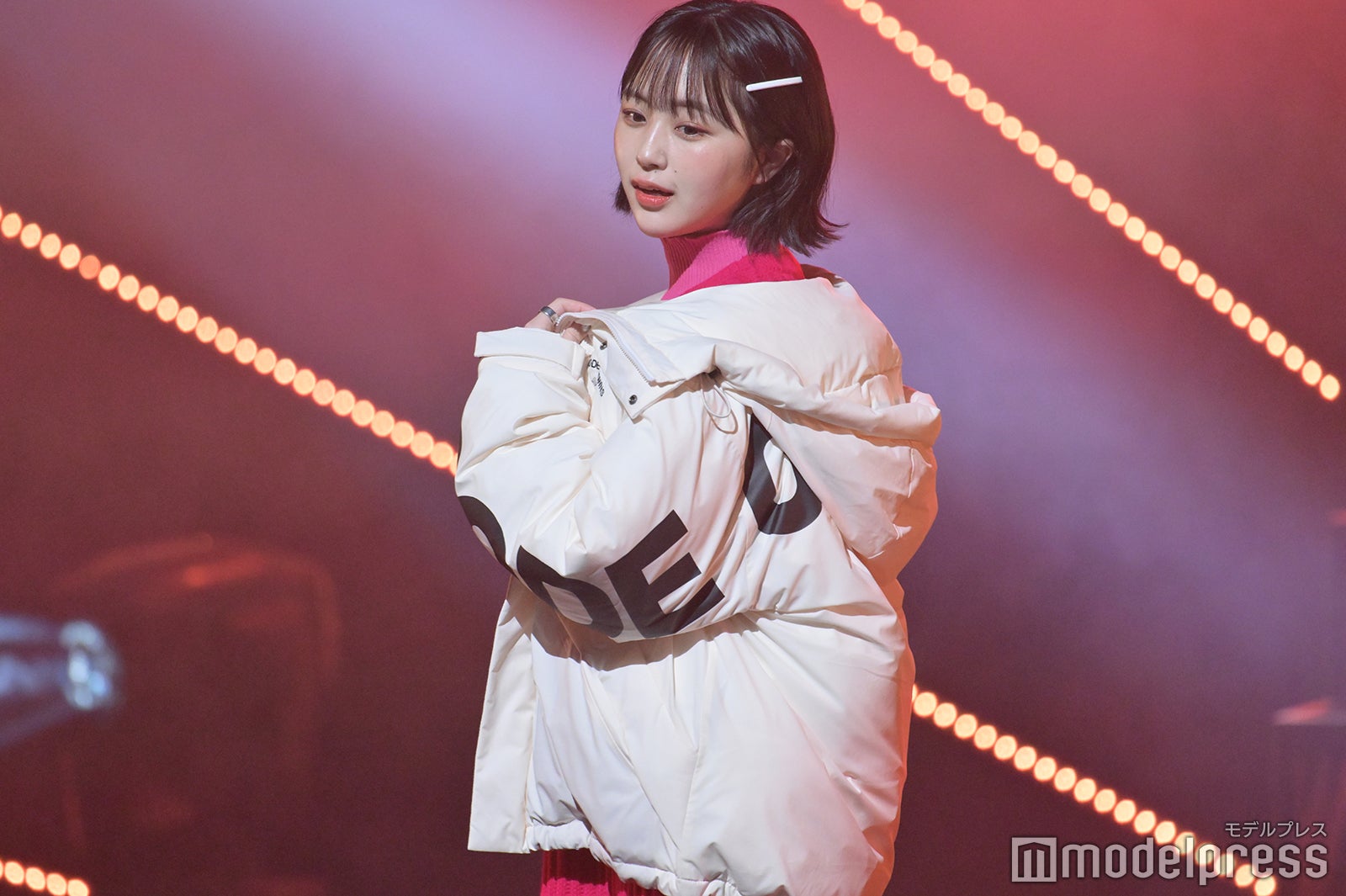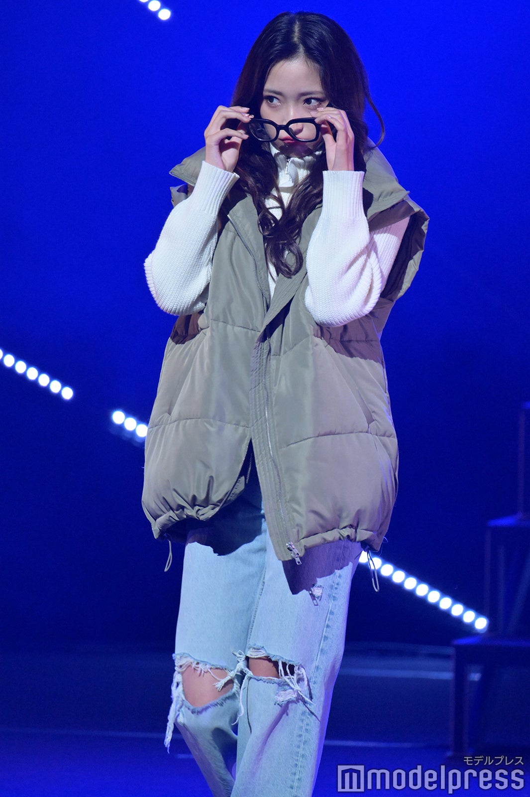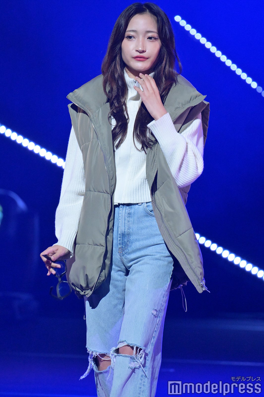 「LIVALIE」ステージに登場したみりちゃむは、白のダウンベストに黒のロングブーツを合わせたトレンドコーデで登場。スラリと伸びた美脚をチラ見せし、颯爽とランウェイした。