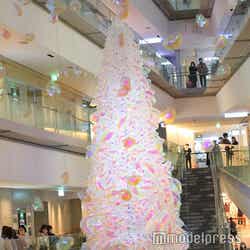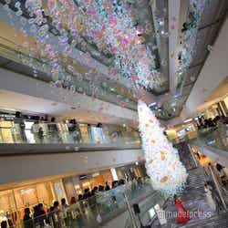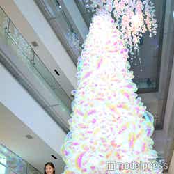 オフショルダーのドレスに、きらびやかなジュエリーを身にまとった新木。着用したドレスは「点灯式に向けてスタイリストさんと話して、いくつか候補があったのですが、先ほど下見でツリーを見てから色や形を決めました。クリスマスらしい王道の赤がこの場に映えるなと思ったので、より点灯式にふさわしいドレスを選べたんじゃないかな」と微笑みを浮かべた。ジュエリーも「角度によってさまざまな色に輝く素敵なものを着けられて、点灯式にぴったり」とご満悦だった。今年、表参道ヒルズに飾られるのは「浮遊する光のバルーンツリー」。小さなバルーンが集積した高さ9mのツリーとなっている。新木が点灯ボタンを押すと、ツリーのほか会場いっぱいに散りばめられた約1万4000個のバルーンが一斉に輝き出した。新木は「さまざまな形の色に変化する、今までにないツリーだと思います。多様性をアートで楽しめる素敵なイルミネーションを点灯できて嬉しいです」と声を弾ませた。