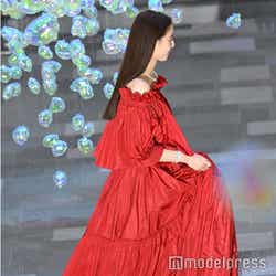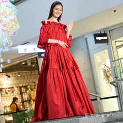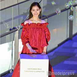 女優の新木優子が16日、表参道ヒルズのクリスマスイルミネーション点灯式に出席。真っ赤なロングドレス姿で登場し、会場を魅了した。