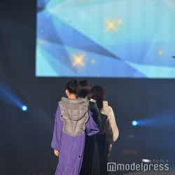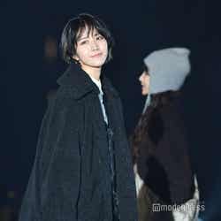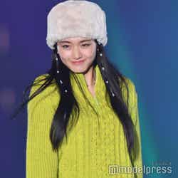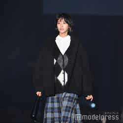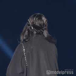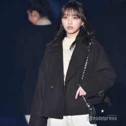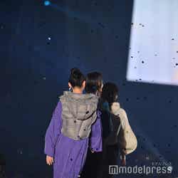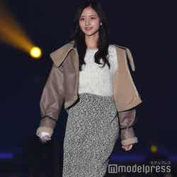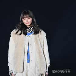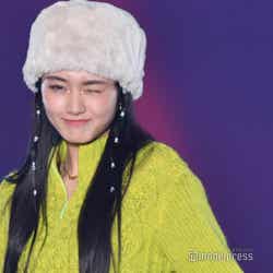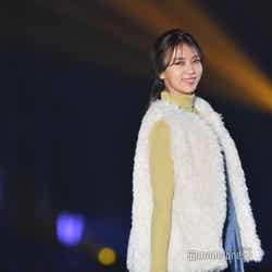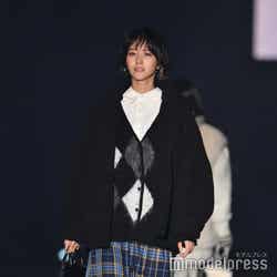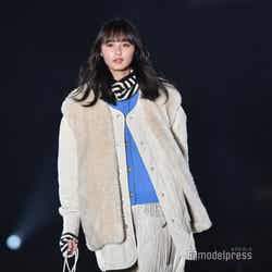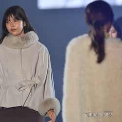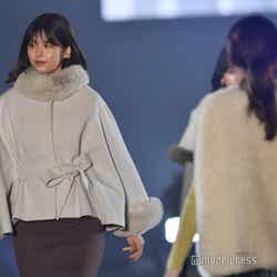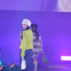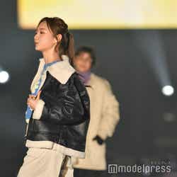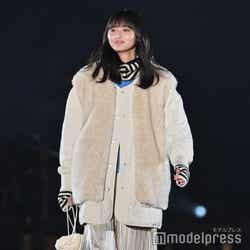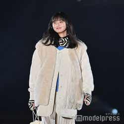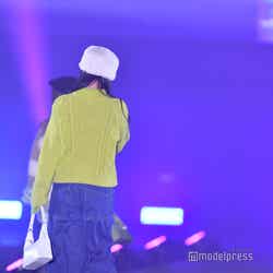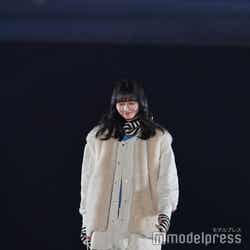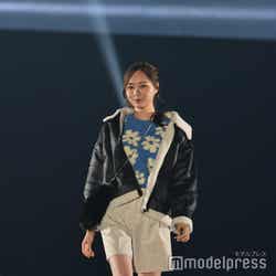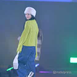 金川は「RETRO GIRL」のステージに登場し、ボリューミーなボアジャケットにライトグリーンのカラータイツで足元が映えるコーディネートに身を包んだ。ランウェイトップでは、口元に人差し指を当てて微笑む仕草で、可愛らしく“あざとい”一面も見せた。