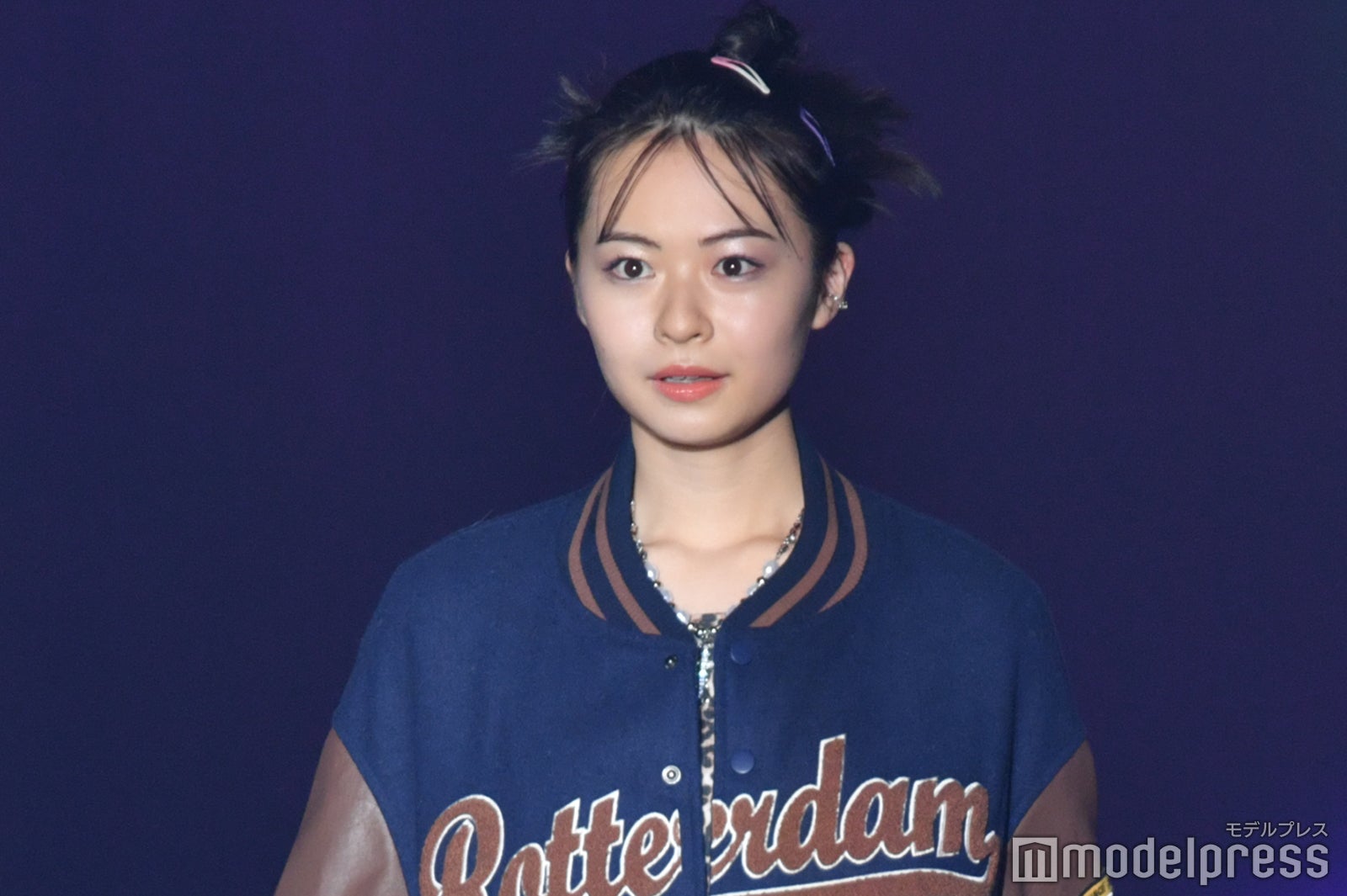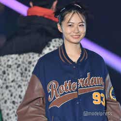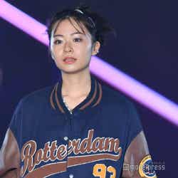 「WEGO」ステージに登場した莉子は、「Y2K」のギャルをテーマにしたコーディネートを披露。プリーツスカートにボリュームのあるブーツ、さらにカジュアルなスカジャンといったY2Kアイテムを取り入れたスタイリングを着こなし。ミニ丈スカートからほっそりとした美脚を覗かせた。
