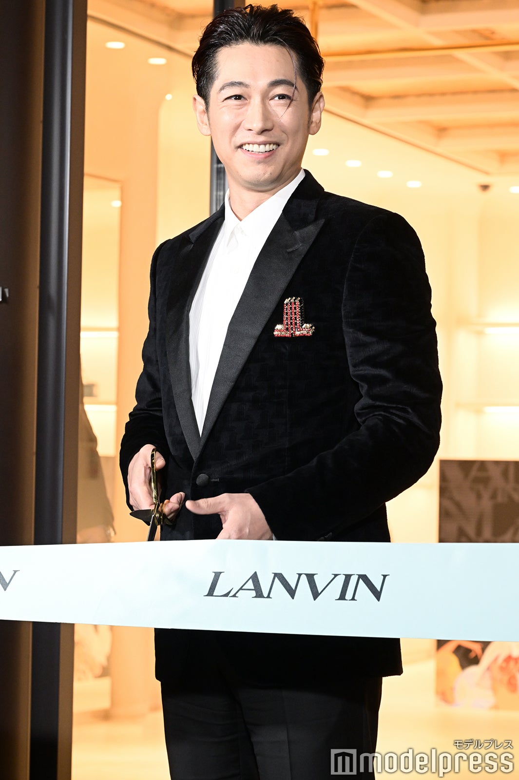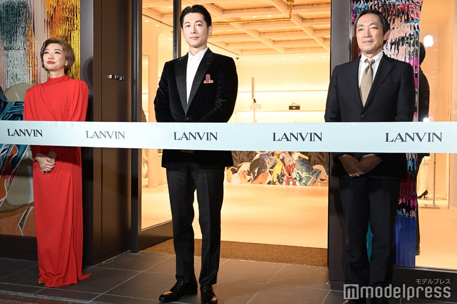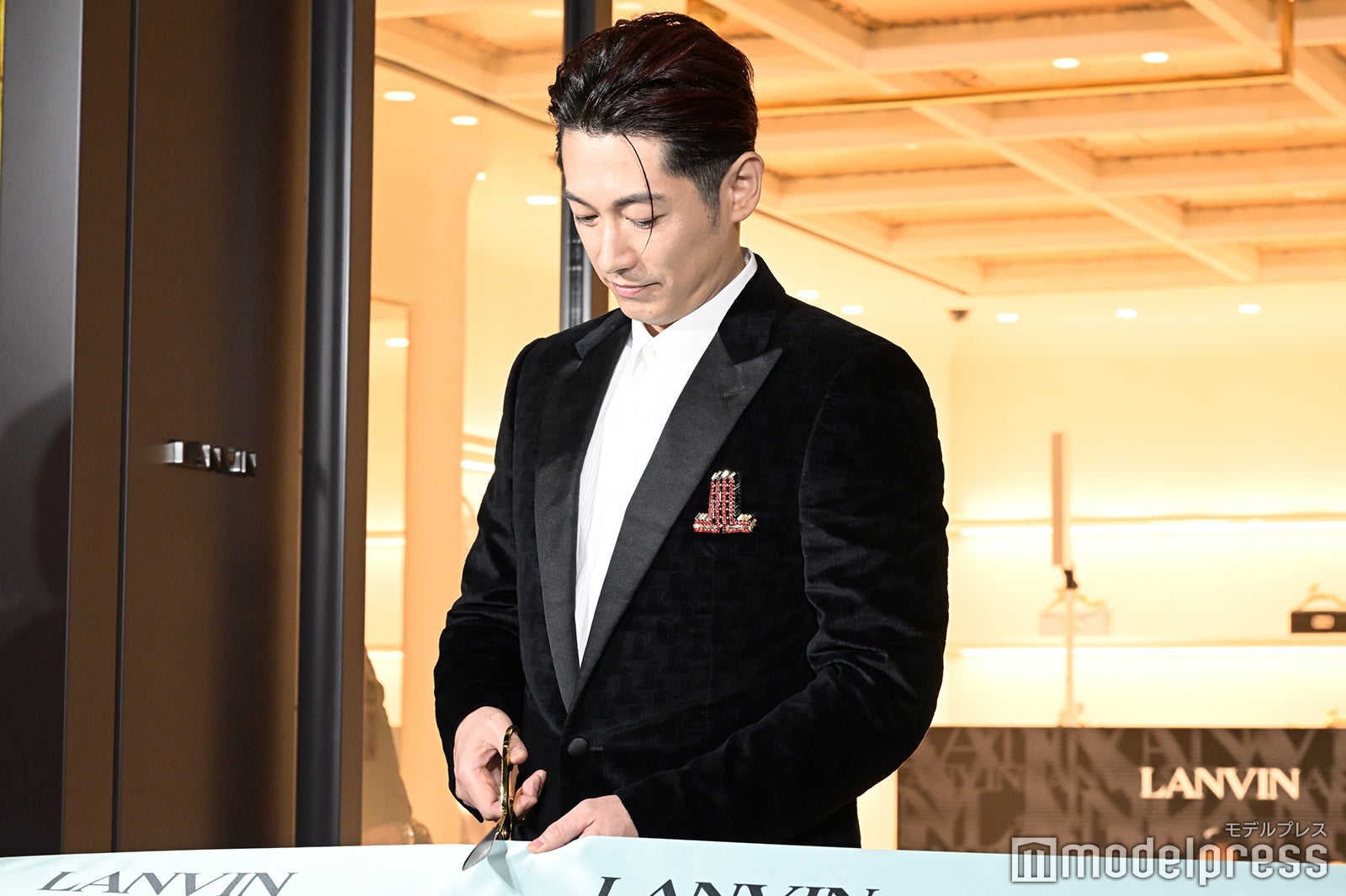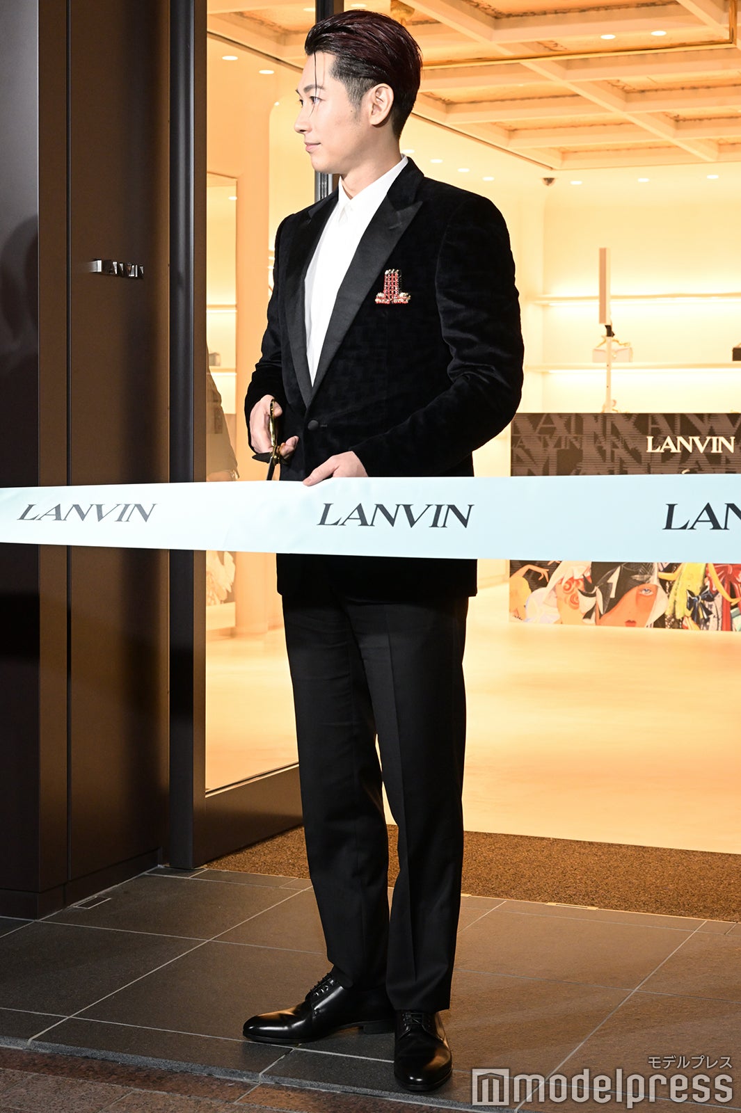 スペシャルゲストとして登場したディーンは、テープカットを行ったあと、店内で質疑応答に応じた。当日の装いについて聞かれると「自分の姿を鏡で見れていれば、いい感じに説明ができたんですけど」としつつ「まずはここですかね。スワロフスキーをあしらった。逆Tの字みたいになっているんですか?」と、創業者ジャンヌ・ランバンのロゴがデザインされた胸元に言及。「よーく見ると、真っ黒に見えて、そのロゴが全身にジャケットの中に埋め込まれているっていうディテールが。たぶん光に当たるとわかると思うんですけど」とポイントを語った。