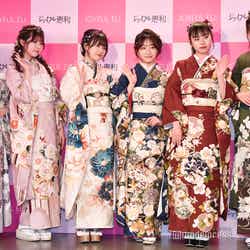 第5期「振袖TEENS」に就任したモデルの石川翔鈴、わたげ、実熊瑠琉、本望あやか、みとゆな、折田涼夏が10日、都内で開催されたお披露目イベントに出席。振袖姿で書き初めを披露した。