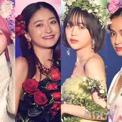 みちょぱ、なえなのをはじめ、現在も静岡県内に在住している人気クリエイター・ひかりんちょ、ファッション誌「JELLY」でレギュラーモデルとして活躍する玖瑠実と、静岡出身のモデルが「SHIZUOKA FLOWER COLLECTION STAGE」に集結。静岡県産の生花をまとい、みちょぱは真っ赤なバラをあしらった美脚際立つ黒ドレス、玖瑠実はピンクを基調としたミニ丈ドレスで、アップにした髪にも花を添えていた。