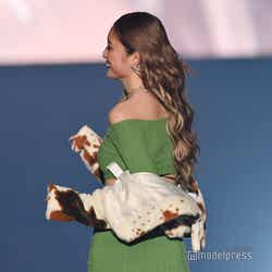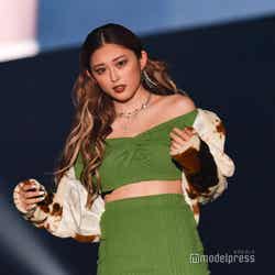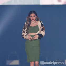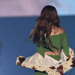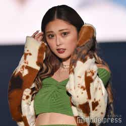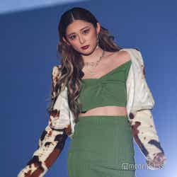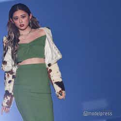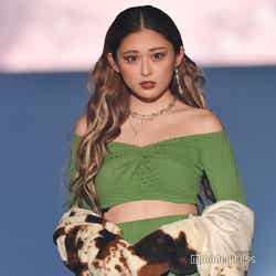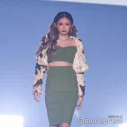 ゆうちゃみは、美しいバストとウエストを覗かせた黄緑のセットアップに、エコファーのジャケットを羽織った着こなしで登場。ランウェイ後のトークでは「新しい自分発見しちゃった」とギャルには欠かせないつけまつ毛を外し、センターパートのヘアスタイルにスモーキーメイクと新しい魅力を発揮したゆうちゃみ。