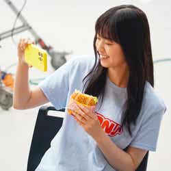 セットチェンジの待機中、スタジオに用意された試食用のテーブルで始まった2人だけの“食レポ”撮影。それぞれの表情をスマートフォンで撮影しながら、西野は「えびカツにこのハンバーガーがめっちゃアジアン!」、飯豊も「このソースとチキンとトマトの組み合わせを考えた人にお礼を言いたい」と笑顔でコメントした。