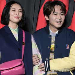 岡田将生はオレンジのオーバーサイズジャケットに柄シャツを合わせたコーディネートで登場。磯村勇斗はグリーンのジャケットに花柄のシャツを合わせたコーディネートで「MARNIらしい柄」をポイントに挙げた。