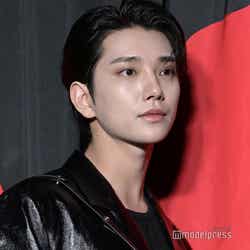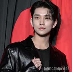 MINGYUは、ブルーのセットアップにグリーンのバッグを合わせスタイリッシュに登場。JOSHUAはブラックのジャケットを羽織り、深いブルーのパンツスタイルを披露した。