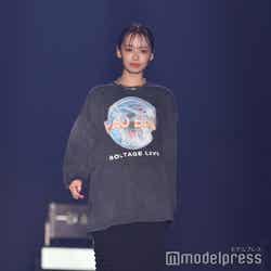 アメリカンカジュアルとヨーロピアントラディショナルを融合させ、時々のトレンド要素を取り入れたデイリースタンダードスタイルを提案するブランドのステージに登場した濱岸。古着風のカジュアルアイテム・ビッグサイズスウェットに、きれいめアイテムとなるタイトスカートを組み合わせたシティライクなカジュアルMIXコーデを着こなし。