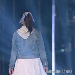ホワイトのミニワンピースにデニムジャケットを合わせた春らしいスタイルで、リボンのついたポニーテールを揺らしながら登場した田村。顔の横で可愛らしいポーズを決め、会場を沸かせていた。「TGC 2023 S/S」テーマは「NEW EPOCH」