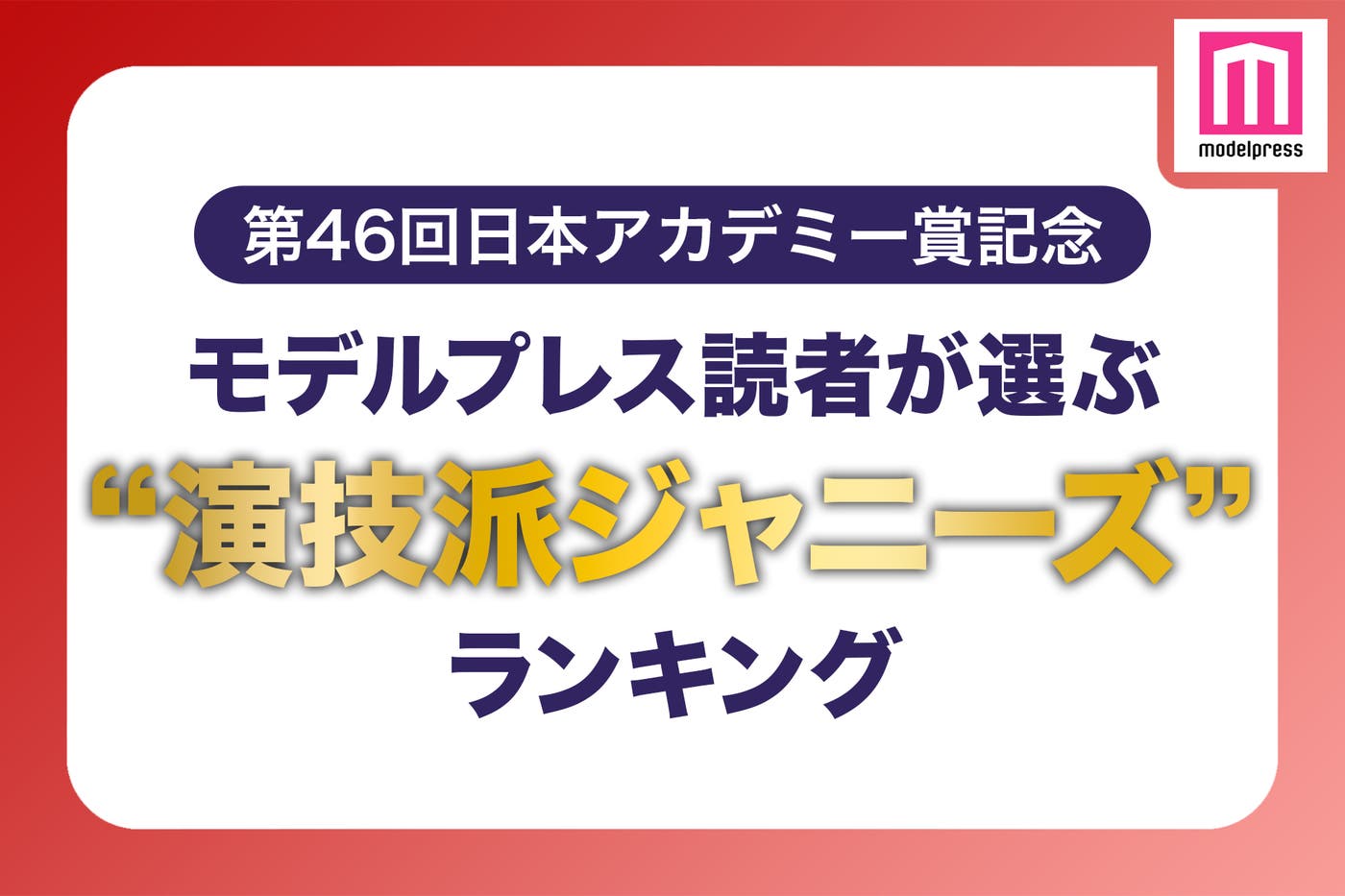モデルプレスはこのほど、3月10日に開催される「第46回日本アカデミー賞」授賞式に合わせ、「あなたが思う“演技派ジャニーズ”は?」をテーマにウェブアンケートを実施。モデルプレス読者が選ぶ「“演技派ジャニーズ”」トップ20を発表する。