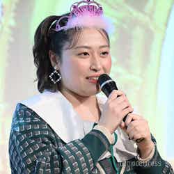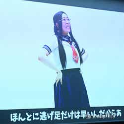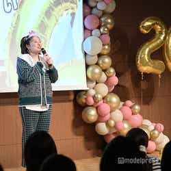 持ちネタである“井上千晶”などおなじみのキャラクターの数々が登場するオープニング映像に続いて登場した丸山。「やばーい!嬉しい!みんな~!こんにちは〜!よろしくお願いしまーす!」とファンとの対面に喜びを見せ「幸パウダー」を振りかけて会場を沸かせた。リアルイベントの開催については「4年ぶりなんですが、いろんなこともありましたよね。世界がやっと元気になってきたと思いますので、丸山もむくむく元気になってきました~」とコメント。「いろんなこと、たくさん準備させていただいたので、今日はお楽しみいただければなと思うんですが、まずはちょっと今日のビジュとかを誉めていただきたい」と呼びかけた。