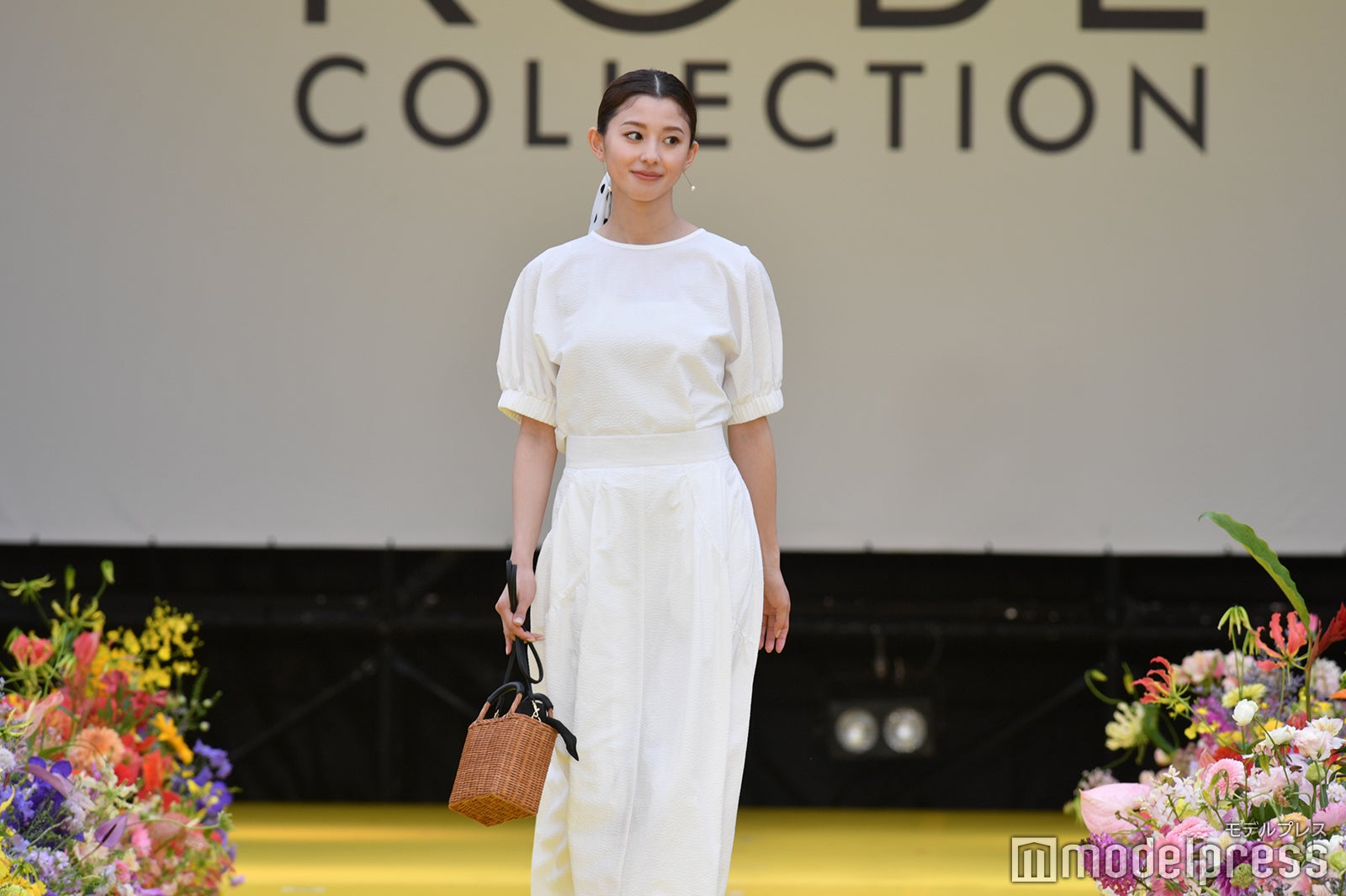 兵庫県出身の朝比奈は、白のワンピースにカゴバックを合わせた爽やかな装いで登場。スカーフ風ヘアアクセサリーを揺らし、クールにランウェイを闊歩した。ランウェイトップでは微笑みを見せ、集まった観客の歓声に応えた。
