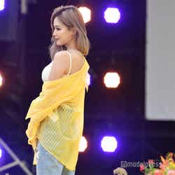 美しいくびれが際立つミニ丈キャミソールに、イエローの透けシャツを重ねたコーディネートで登場したせいせい。肩を落としてシャツを着用することで、“抜け感”を演出した。ランウェイでは、投げキスやハートポーズを次々と披露し、集まった観客の声援に応えていた。