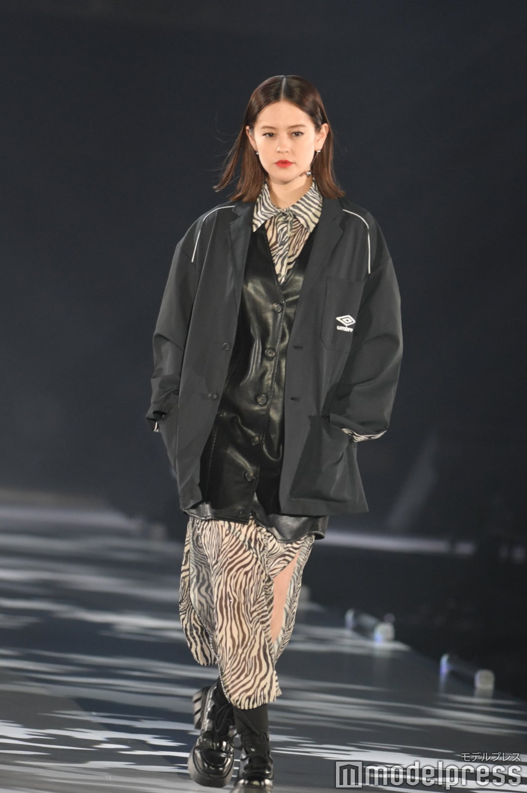 地元・北海道出身のemmaは、前回の「2022 AUTUMN/WINTER」に引き続き、本編ファッションステージのトップバッターに抜擢。スリットが入ったゼブラ柄のワンピースにジャケットやレザーベストをレイヤードしたコーディネートを着こなし、圧倒的なオーラで会場の視線を集めた。