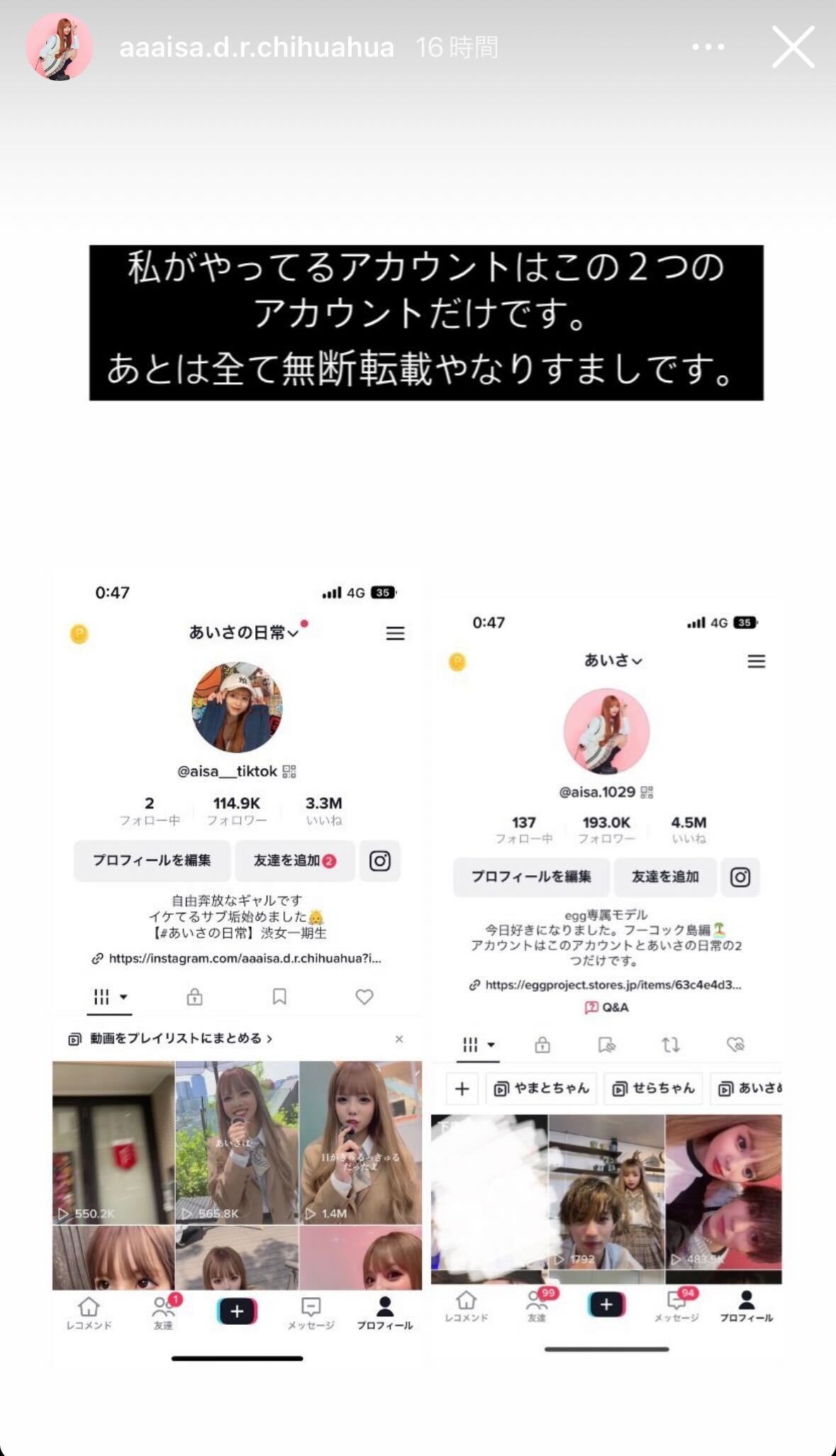 細川は「よく最近DMで聞かれるのですがこのアカウントは私がやってるアカウントではありません!!」と、なりすましアカウントのスクリーンショットを公開した細川。「私がやってるアカウントはこの2つのアカウントだけです。あとは全て無断転載やなりすましです」と、公式TikTokアカウント2つ(@aisa__tiktok、@aisa.1029)を表示し、注意喚起を行った。