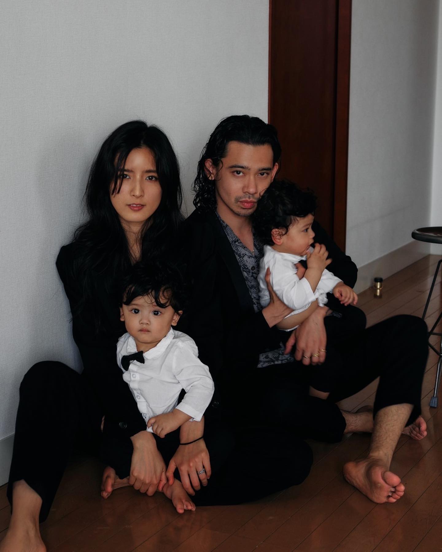 そっくりな一卵性双子の息子が遊ぶ様子や、洋服を黒で統一し、撮影されたクールな家族写真を披露した。