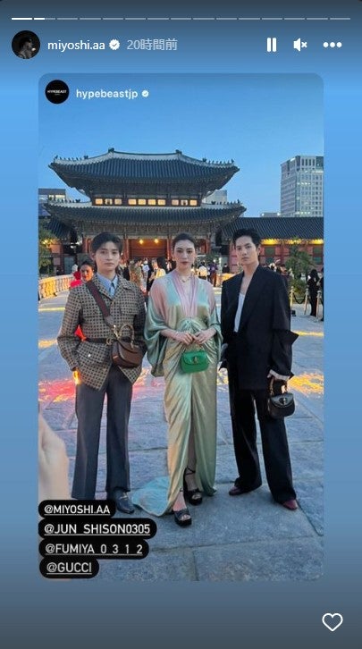 三吉らは同日に韓国で行われたGUCCIのファッションショーに日本人ゲストとして訪れ、現地で共に過ごしていたとみられる。davikahが投稿した食事の席でのオフショットには、中央にdavikahと三吉が、両側に志尊と高橋が笑顔を見せて写っている。