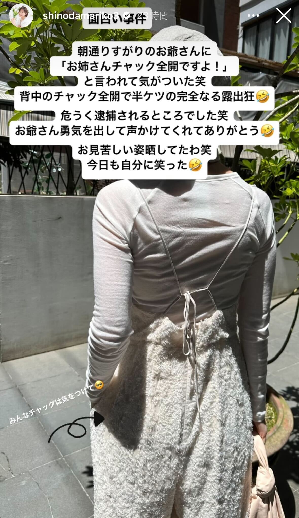 腰の部分にチャックのついた洋服を着用した篠田は、「面白い事件」と前置きし、「朝通りすがりのお爺さんに『お姉さんチャック全開ですよ!』 と言われて気がついた笑」と道端でのハプニングを告白。「背中のチャック全開で半ケツの完全なる露出狂 危うく逮捕されるところでした笑」と当時の状況を振り返った。