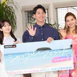 『シャッフルアイランド Season4』は、2021年11月より放送開始された恋愛番組『シャッフルアイランド』シリーズの新シーズンで、運命の恋を求めて集まった美男美女が、南国リゾートの2つの島を舞台に意中のメンバーを指名し合い、島間を“シャッフル(入れ替わって)”していく、恋の駆け引き満載のオリジナル恋愛番組。司会はシーズン1から屋敷、シーズン2から峯岸、新たにシーズン4からゆきぽよも加わり3人で務める。「本能むき出しの恋愛バトル」が見どころの本番組にちなんで「本能がむき出しとなったエピソード」を問われると峯岸は、夫である東海オンエアのてつやとのエピソードを明かした。