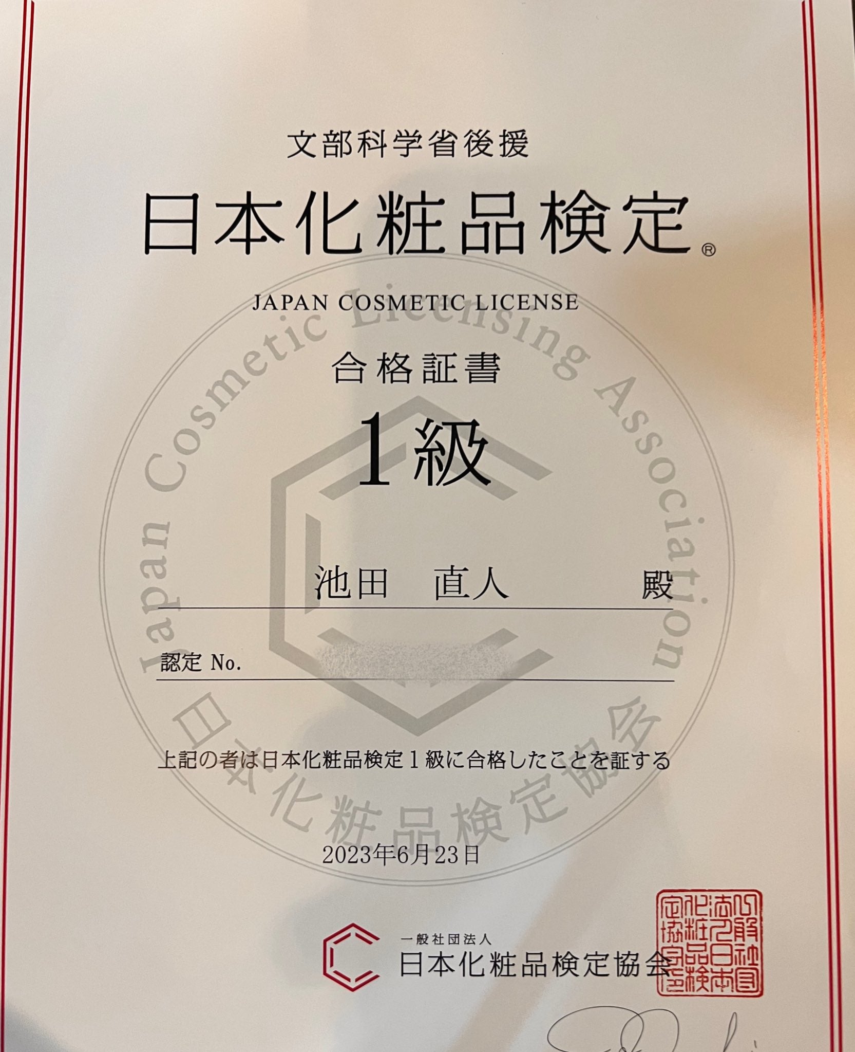 SNS上で上げている女装姿が「可愛すぎる」と一躍話題を呼んでいる池田は、ピースの絵文字とともに、化粧品の成分や安全性、法律に関するルールに加え、ヘアからボディケアまで美容に関する幅広い知識が問われる日本化粧品検定1級の合格証書を写した写真を1枚投稿。またInstagramストーリーズでも、同じ写真を投稿し「わーい」と喜びをつづった。
