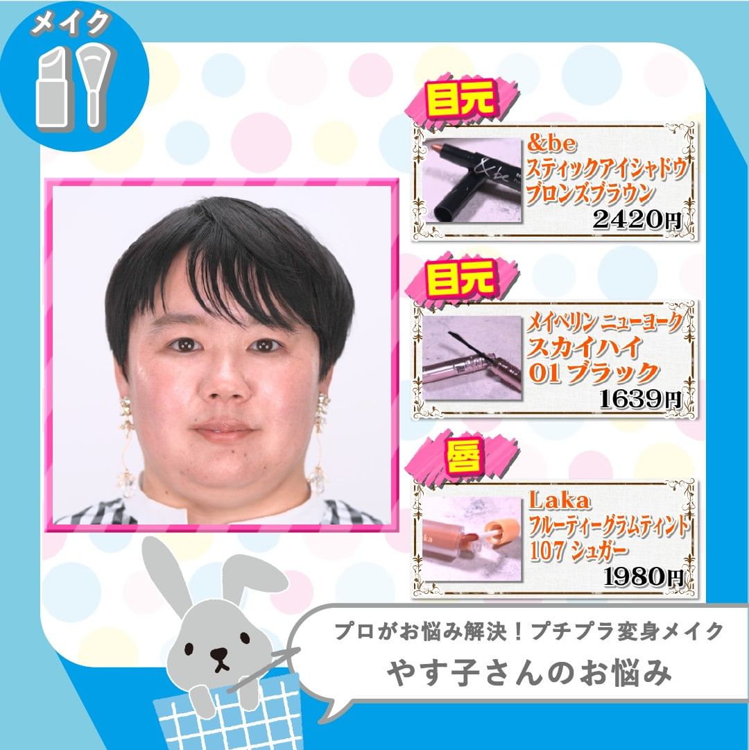 今回の放送では「プロがお悩み解決!プチプラ変身メイク」という企画を実施。やす子が河北に理想である多部未華子風のナチュラルなメイクを施してもらうこととなった。メイク初心者というやす子の悩みに合わせたメイクを行い、いつもの雰囲気から一変した姿に変身。普段とは異なり、前髪をおろした大人可愛い雰囲気の仕上がりとなった。