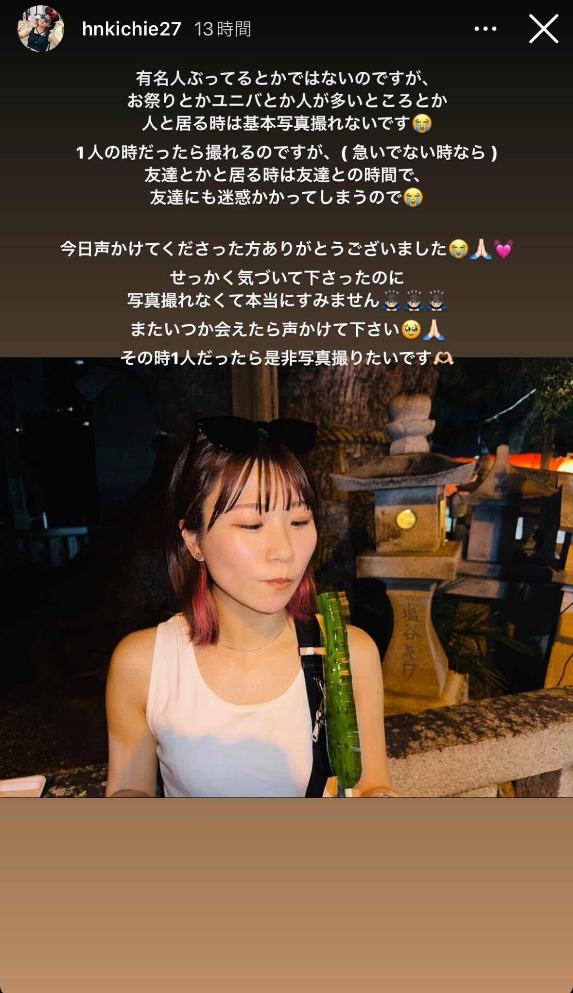 この日、自身を隠し撮りした写真に添えて、対応が良くなかったことについて苦言を呈しているタグ付けされた投稿を引用したいちえは、「盗撮されてこんな事言われるのこわひ」(※本文ママ)とコメント。次の投稿で、「有名人ぶってるとかではないのですが、お祭りとかユニバとか人が多いところとか人と居る時は基本写真撮れないです」とプライベートでの写真撮影について説明し、「1人の時だったら撮れるのですが、(急いでない時なら)友達とかと居る時は友達との時間で、友達にも迷惑かかってしまうので」とその理由を明かし、ファンに“お願い”を行った。