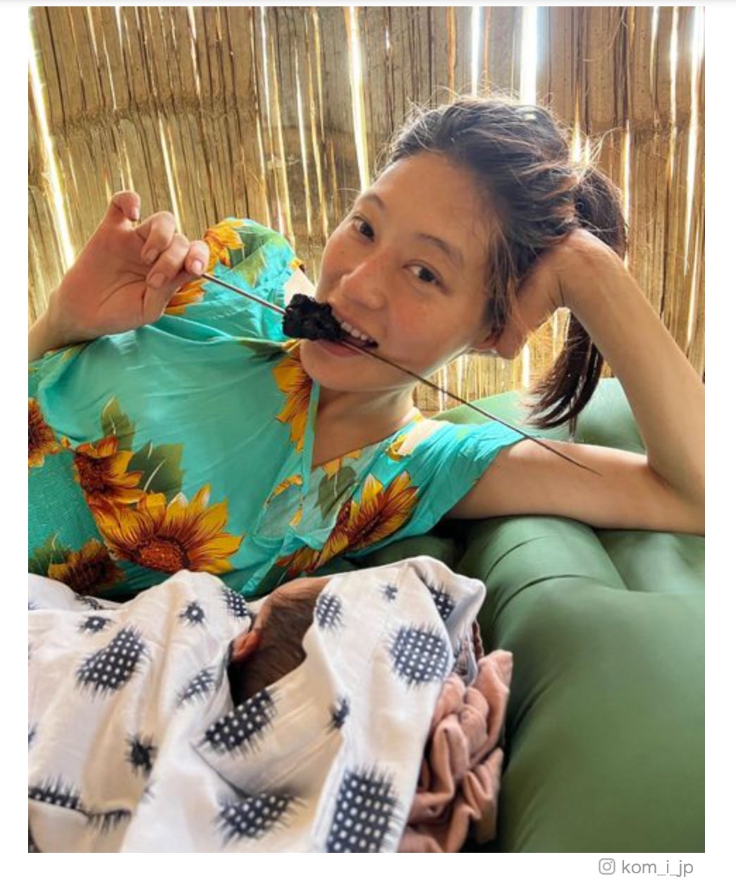 そして「笑ってしまうようなこともいろいろあったけど、いったん乳あげマンに戻り、大事な生活を楽しみ、またご報告します!」と今後の生活について伝えたコムアイ。串焼きのようなものを食べる自身と第1子が寝そべっている写真を公開し「胎盤を薪火で焼いてもらったのを食べているところ。生も焼きもめちゃくちゃ美味しかった!」と胎盤を食した感想をつづっている。