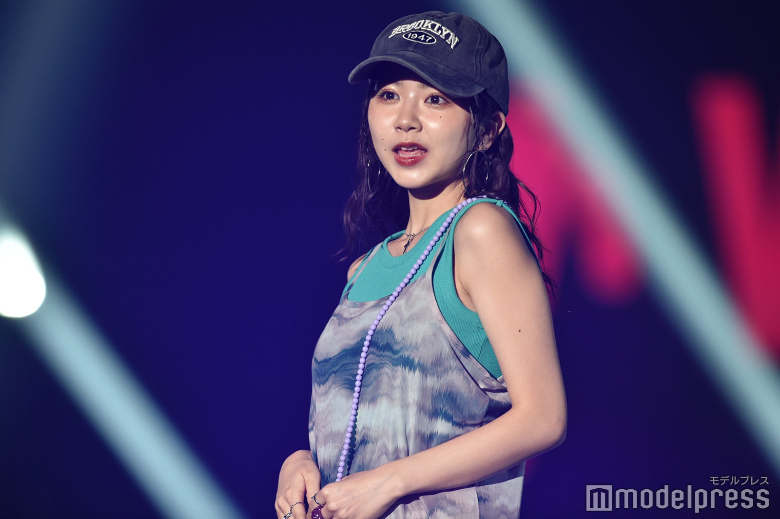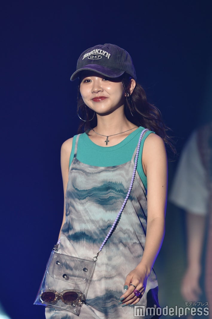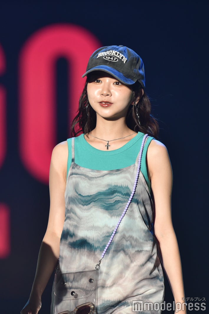 2022年より雑誌「JELLY」の専属モデルを務める高梨は、ブラウンのリップが大人っぽいメイクで登場。グリーンのノースリーブトップスにキャミソールワンピースを重ね、キャップを合わせたストリートミックスなスタイリングを披露した。