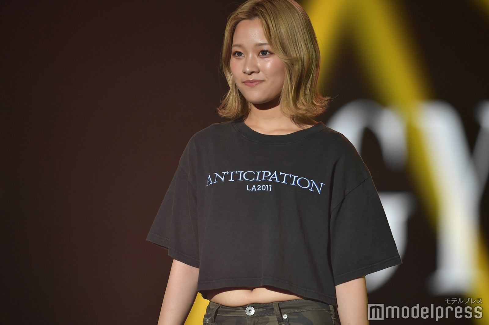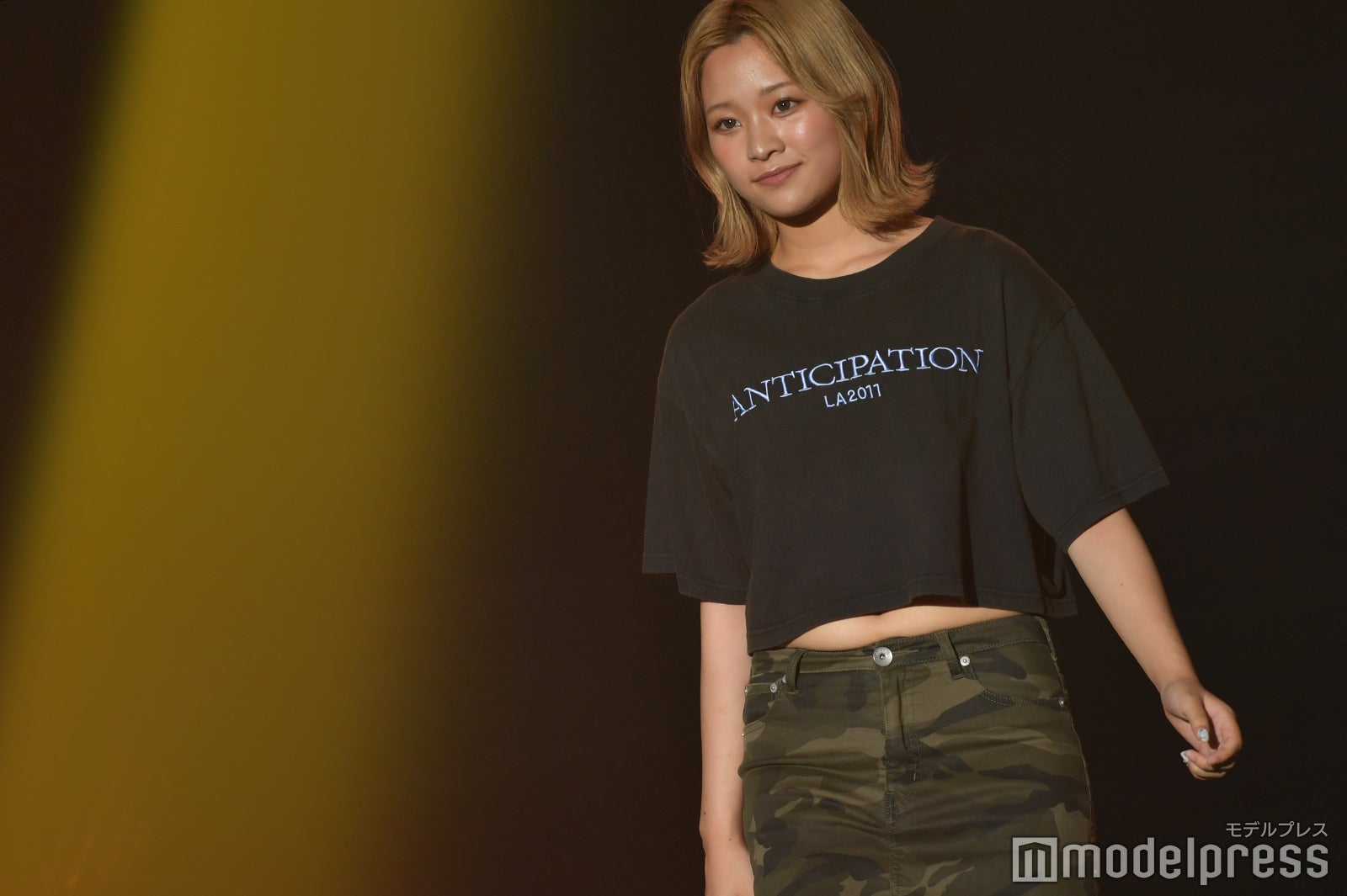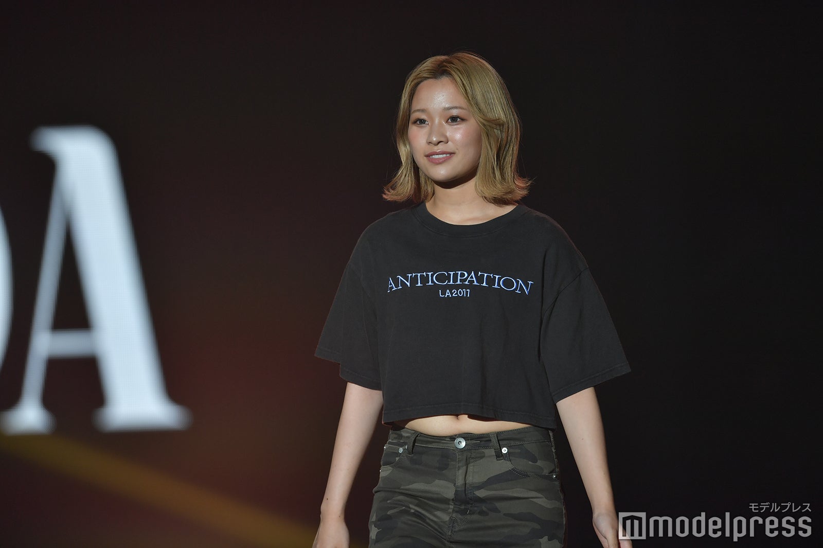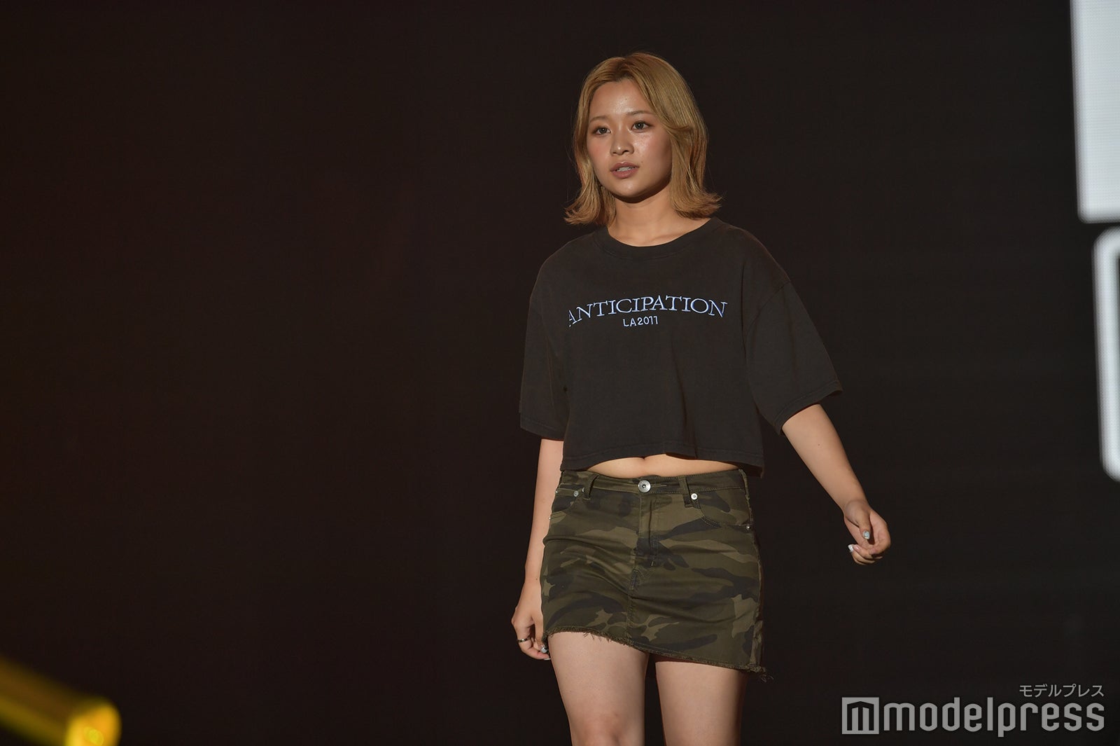 イベント序盤のステージに登場した上ノ堀。黒いトップスに迷彩柄のミニスカートを合わせたカジュアルスタイルを披露した。ミニ丈トップスからはウエストがチラ見え。ランウェイでは、金髪がキラリと輝き、イメージがガラリと変わった姿に観客からの熱視線を集めていた。