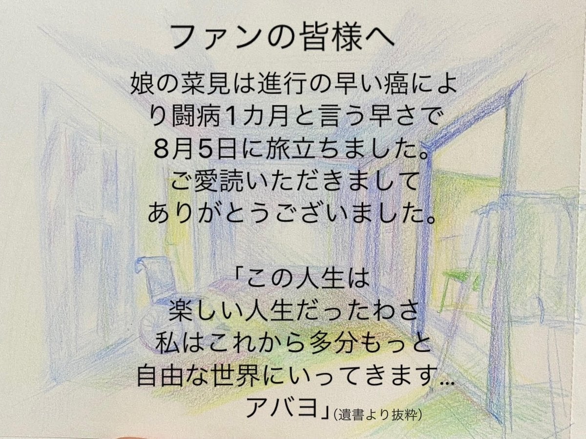また、佐野さんの遺書から抜粋されたという文書には「この人生は楽しい人生だったわさ。私はこれから多分もっと自由な世界にいってきます…アバヨ」とつづられていた。