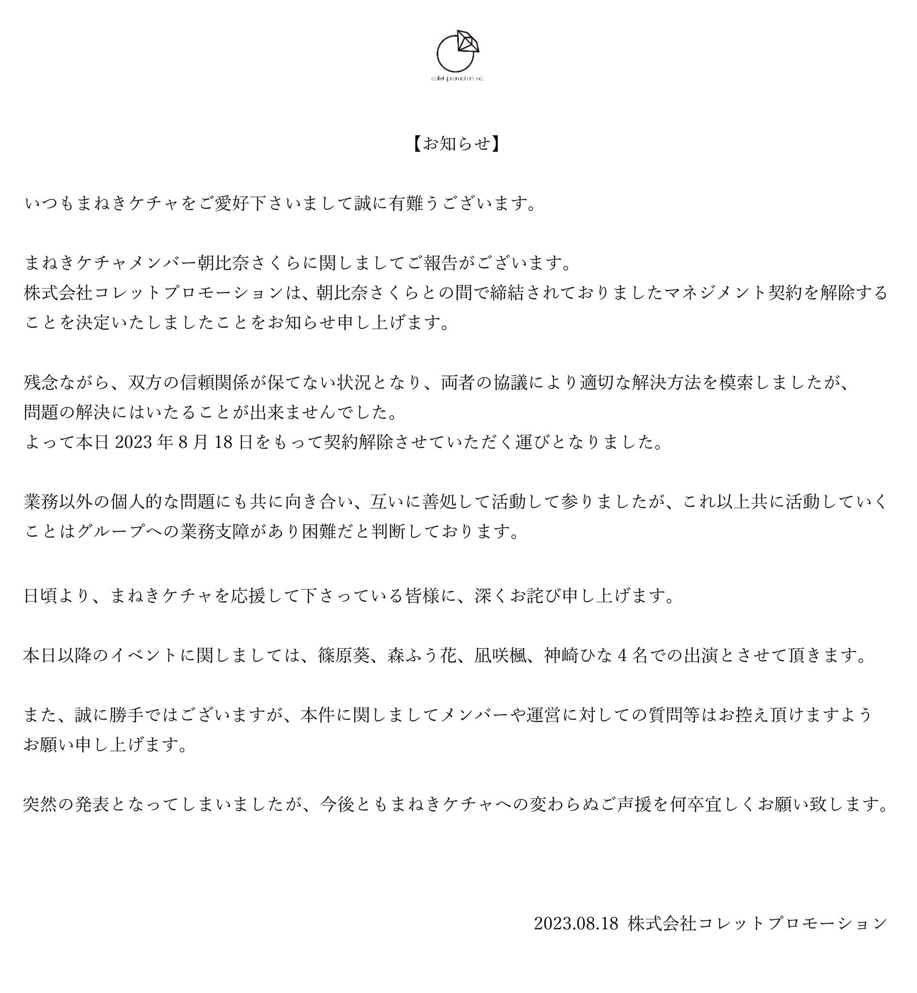 グループの公式Xでは、「株式会社コレットプロモーションは、朝比奈さくらとの間で締結されておりましたマネジメント契約を解除することを決定いたしましたことをお知らせ申し上げます」と報告し、「残念ながら、双方の信頼関係が保てない状況となり、両者の協議により適切な解決方法を模索しましたが、問題の解決にはいたることが出来ませんでした」と経緯について説明。朝比奈が、18日をもって契約解除となったことについて「業務以外の個人的な問題にも共に向き合い、互いに善処して活動して参りましたが、これ以上共に活動していくことはグループへの業務支障があり困難だと判断しております」とつづり、「日頃より、 まねきケチャを応援して下さっている皆様に、深くお詫び申し上げます」と謝罪した。