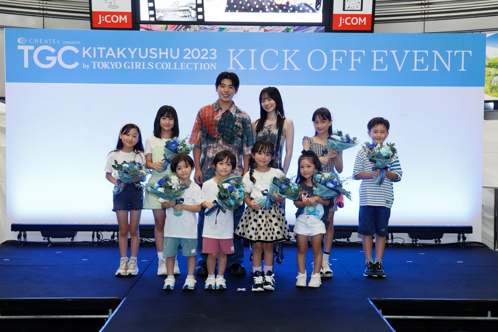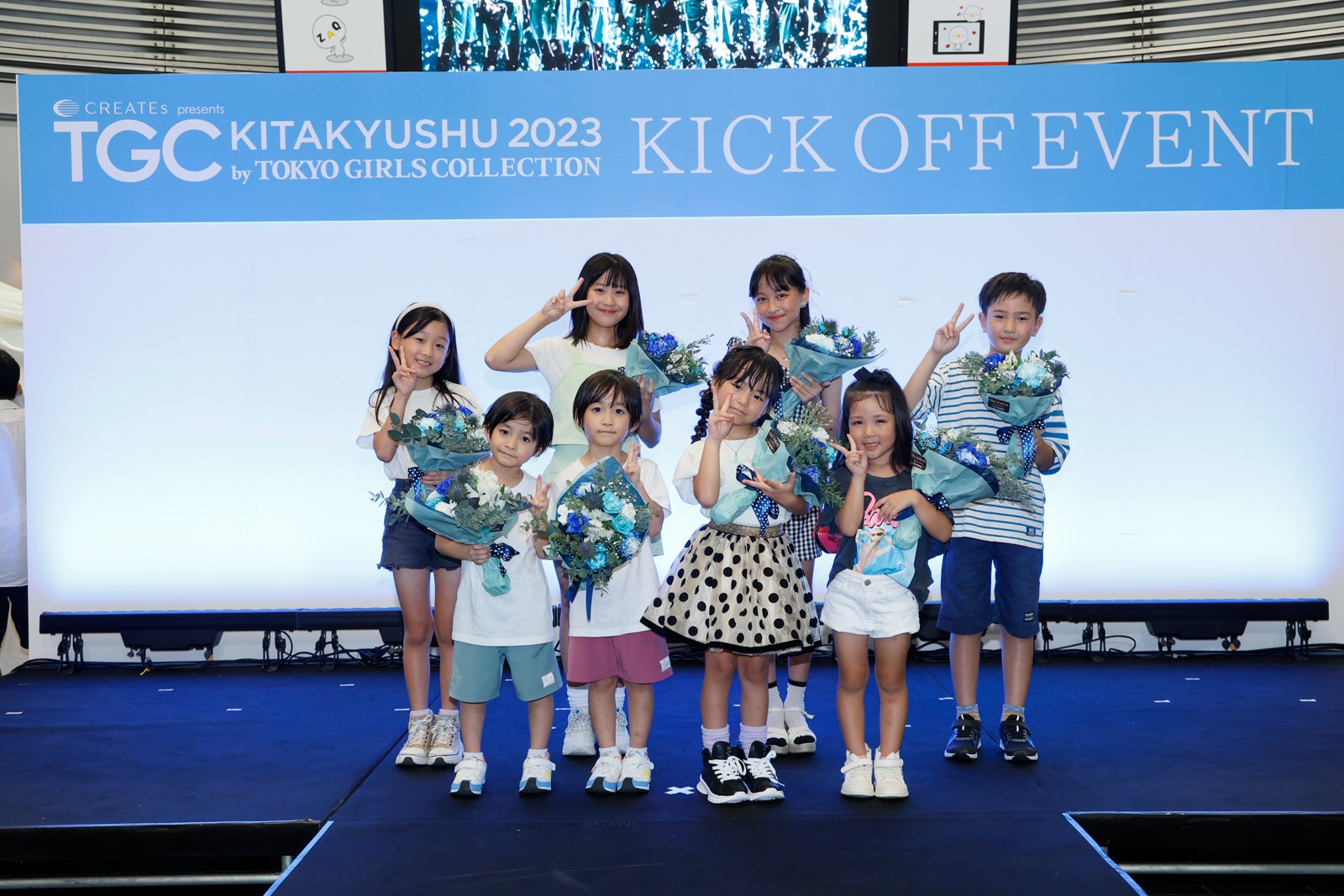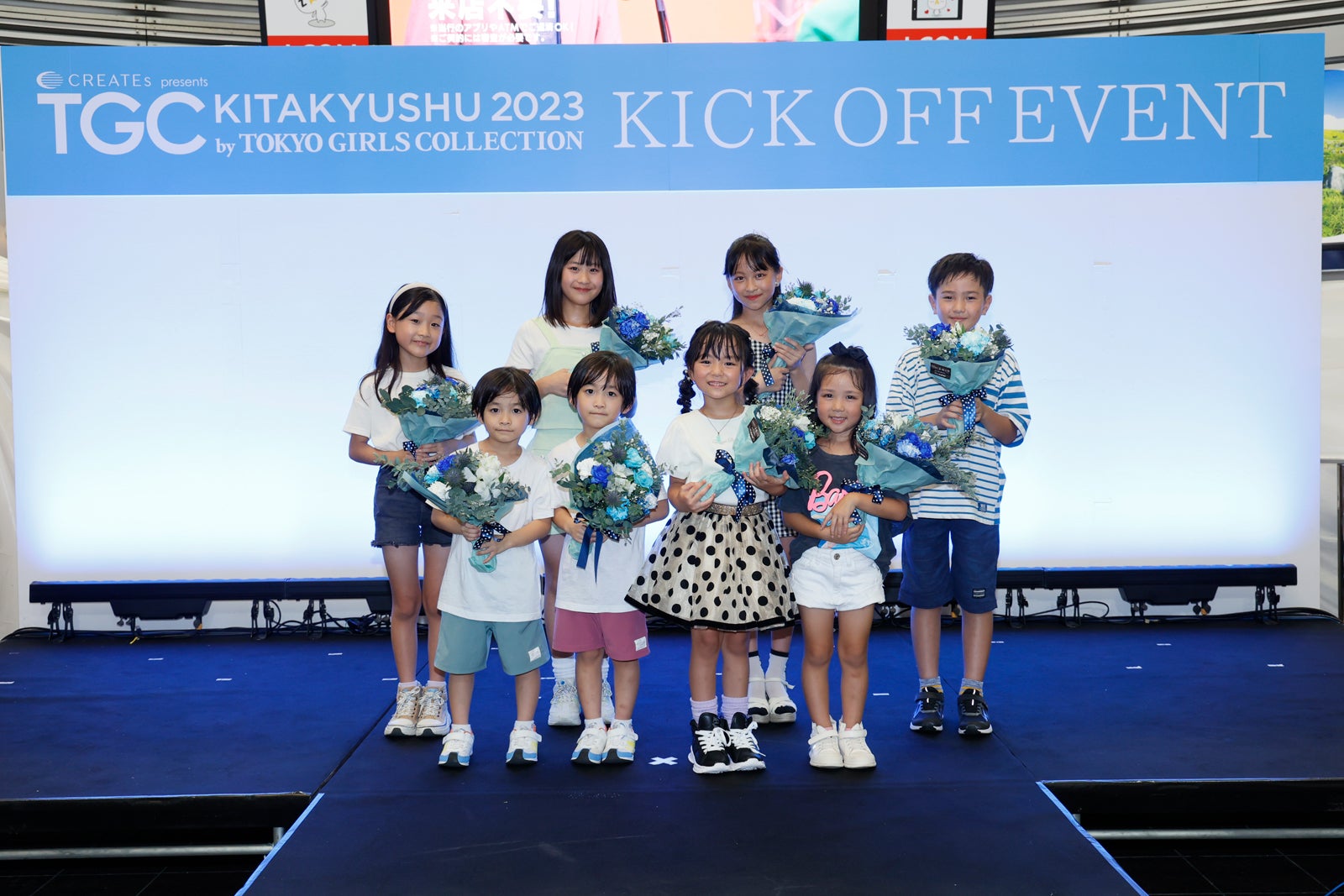TGC北九州の新たな歴史の幕開けを記念して、北九州市の「福岡のキッズに、ランウェイを歩く機会を。」という思いのもと、地元・福岡県在住の5~12歳(※応募時の年齢)のキッズを対象に募集をした「TGC KITAKYUSHU 2023 キッズモデルオーディション」には、約150人ものキッズが応募。審査を通過した15人のキッズが公開最終審査に参加し、1日15万人が訪れる小倉駅の中心「JAM広場」にて、ウォーキングを披露。「TGC 北九州 2023」に出演する8人のキッズモデルが決定し、福岡県産の花束が贈呈された。