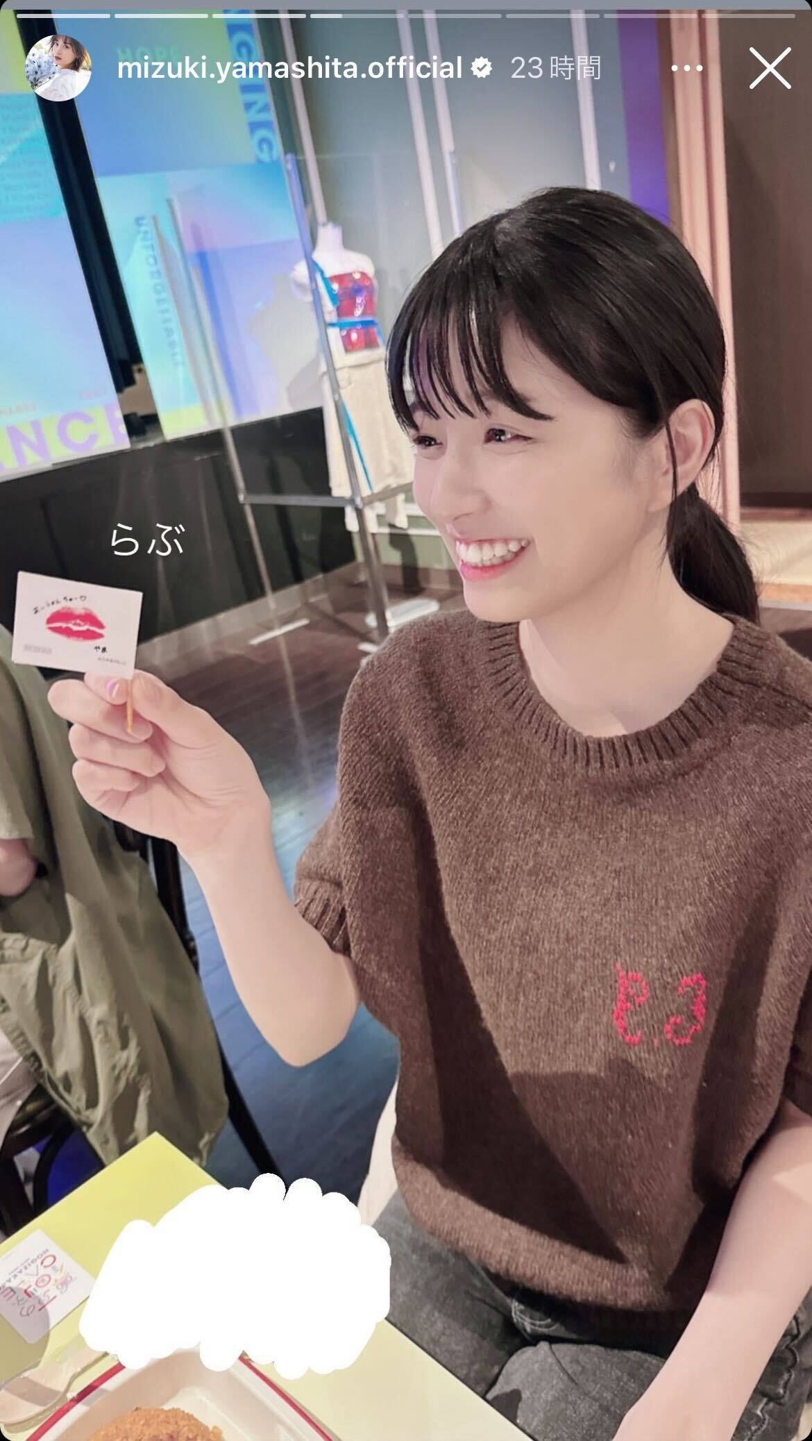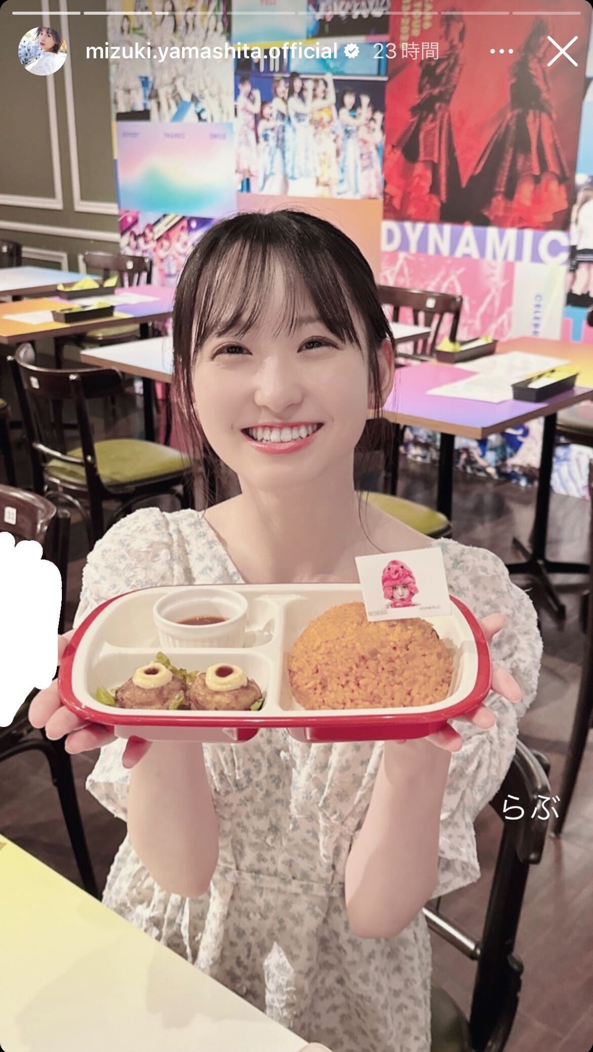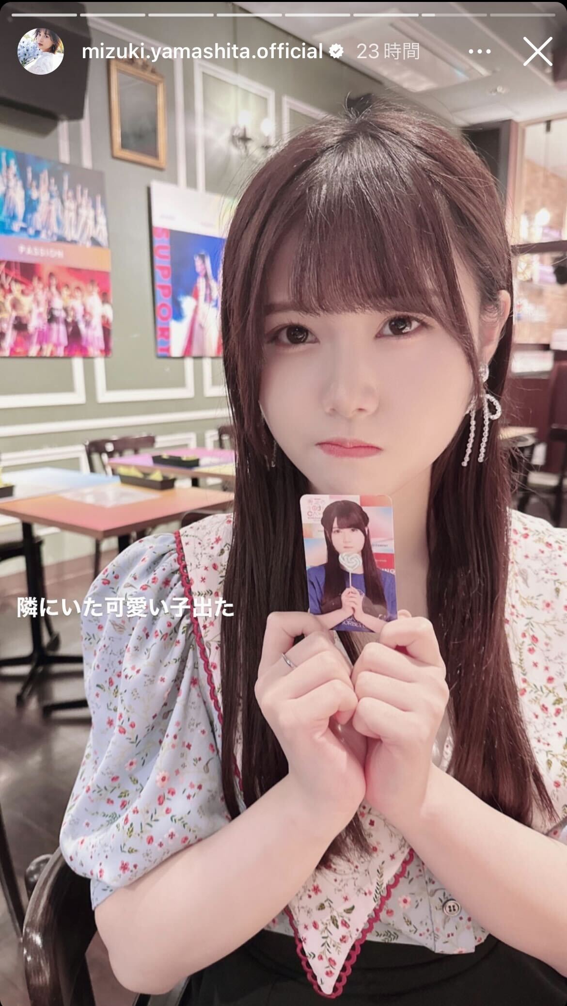 山下は「先日乃木坂Cafe行ってきました!」としメンバーの伊藤理々杏・岩本蓮加・一ノ瀬美空・五百城茉央の写真を続々アップ。メンバーそれぞれがプロデュースしたコラボメニューを味わったことを写真で報告。特典のフォトカードではまさかの伊藤が登場し、動画にて「すご!理々杏だ!」と述べ、「隣にいた可愛い子出た」と写真とともにつづった。