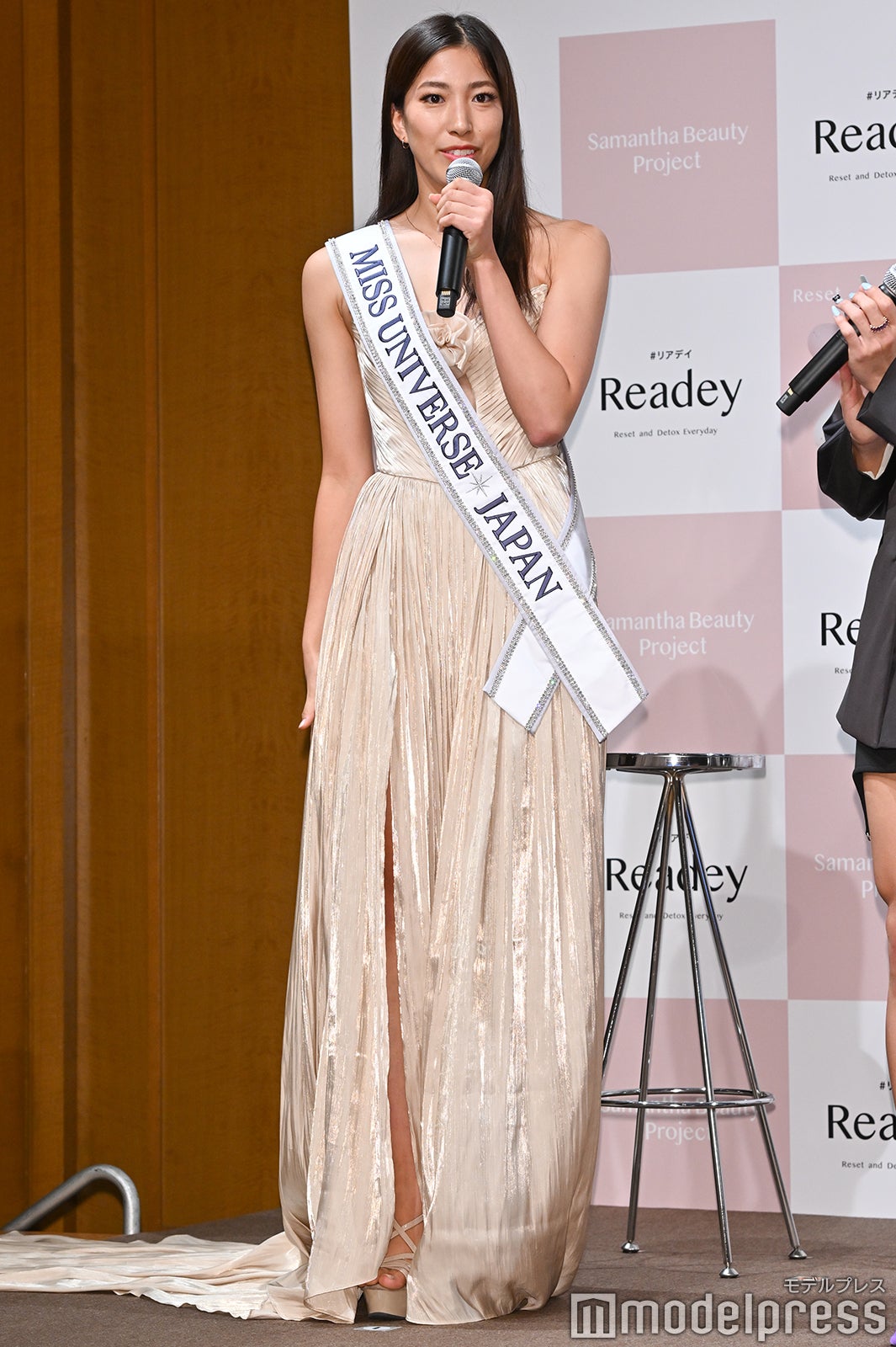 ボディラインが際立つピンクのタイトドレスで登場したせいらは美しいデコルテを披露。とうあはスラリとした美しい脚を見せたブラックのフォーマルなドレス姿で登場した。また、同商品のプロデュースに関わり、ミントグリーンの色を提案したという井手上は「ミントカラーなんですけど、グリーンの中でもピスタチオカラーが私は好きで、グリーンって怒りを軽減させるとか、癒し効果があるらしくて、私も普段、髪が長いので使うものは目から見たものでストレスフリーなものがいいなと思って、カラーにもそれを加えたいなと思いました」と語り、「グリーンと言ってもいっぱいあるので、グリーンの中でも何百色とみなさんで出し合って、今回決めさせていただきました」とアピールした。