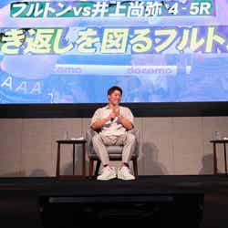 7月25日に有明アリーナで開催された「WBC・WBO世界スーパーバンタム級タイトルマッチ」で勝利し、見事2団体統一王座を獲得、4階級制覇を果たしたプロボクサー・井上選手。本イベントでは、井上選手のフィジカルトレーニングを担当した大橋ボクシングジム・八重樫東トレーナーとともに登壇し、世界戦の試合映像のダイジェストを参加者とともに視聴。フルトン選手との激闘を振り返った。井上尚弥選手、ファン100人を前に今後の展望語る