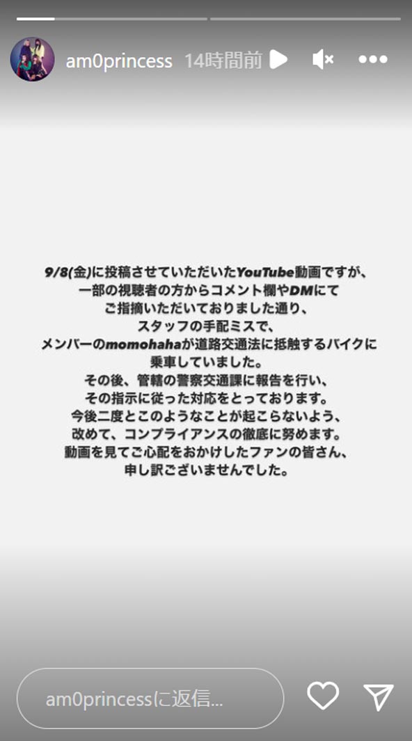 ストーリーズでは「9/8(金)に投稿させていただいたYouTube動画ですが、一部の視聴者の方からコメント欄やDMにてご指摘いただいておりました通り、スタッフの手配ミスで、メンバーのmomohahaが道路交通法に抵触するバイクに乗車していました」と報告。その後は「管轄の警察交通課に報告を行い、その指示に従った対応をとっております」といい、「今後二度とこのようなことが起こらないよう、改めて、コンプライアンスの徹底に努めます。動画を見てご心配をおかけしたファンの皆さん、申し訳ございませんでした」と謝罪した。momohahaもこのストーリーズを引用する形で、「ご指摘いただいた皆様ありがとうございます。私も気づかず乗ってしまい皆様にご心配とご迷惑をおかけし申し訳ございませんでした」と謝罪。続けて「より一層身を引き締めて頑張りますので引き続きどうぞよろしくお願い致します」と呼びかけた。