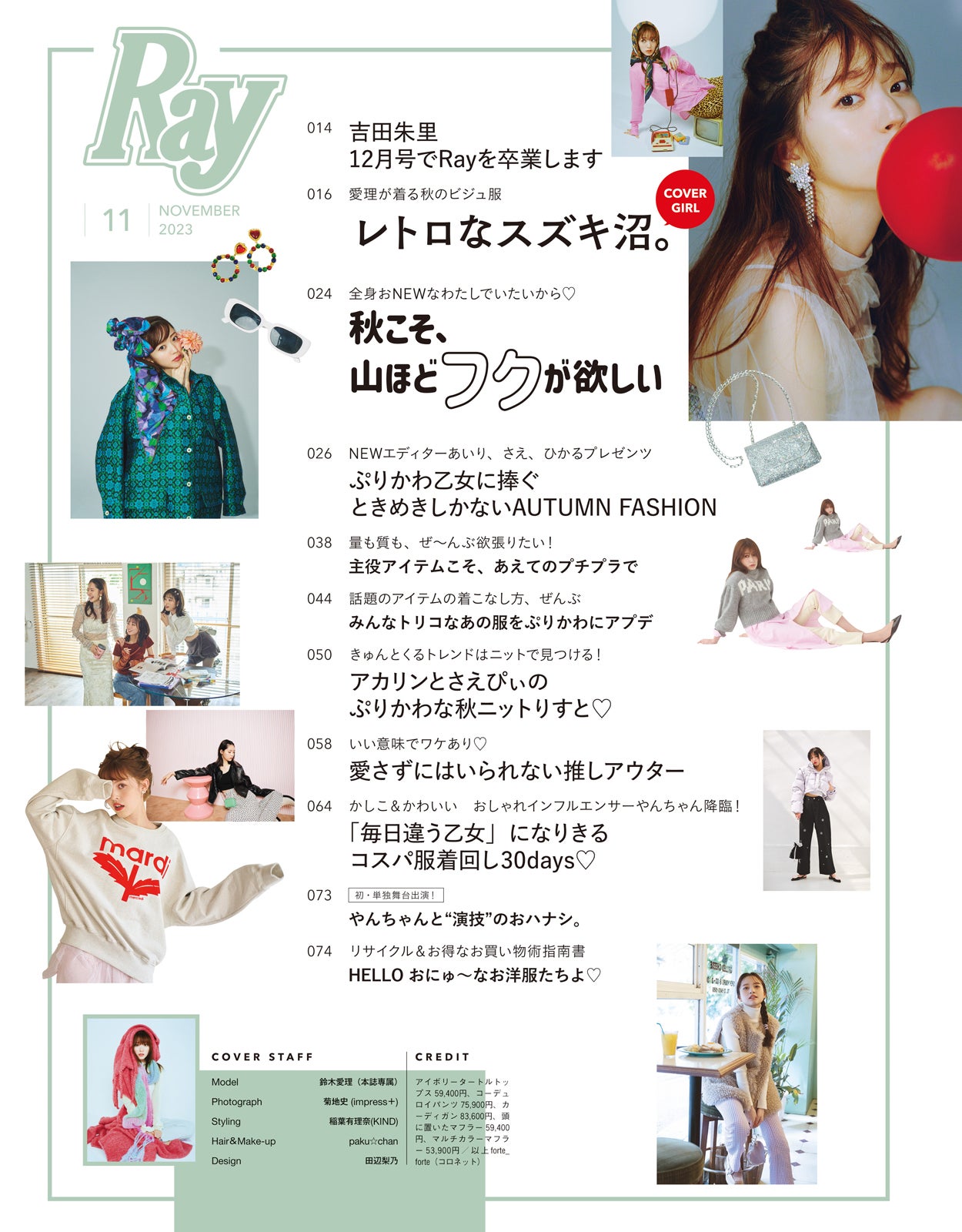 「レトロなスズキ沼。」と題して、鈴木が秋におすすめしたいビジュ映え確実なレトロ服に身を包んで登場。皆が愛してやまないレトロな世界観と、鈴木。そんな沼全開な世界線を届ける。今号の特集は「秋こそ、山ほどフクが欲しい」おしゃれが楽しい秋の幕開けということで、あえて主役アイテムをプチプラにする方法から、まっ先に買うべきトレンド服など、賢くお買い物をして、山ほどフクをGETするためのアイディアをたっぷりと紹介している。