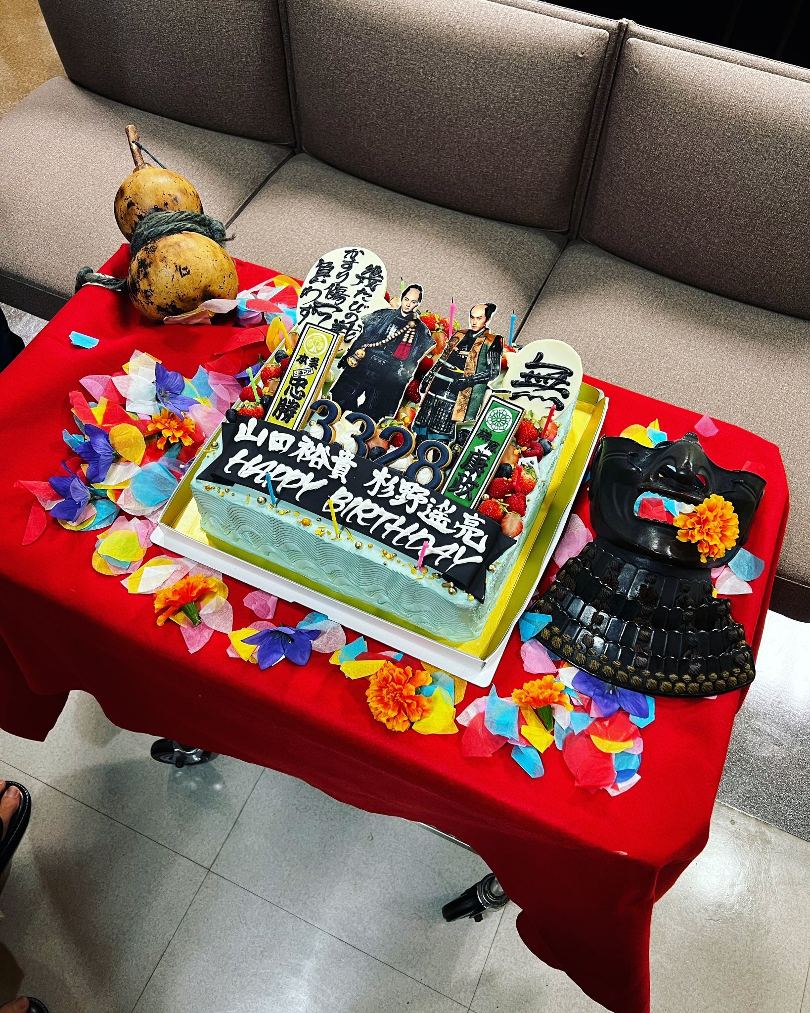同日に誕生日を迎えた山田は「33歳になりました まずはビッグバンが起きて宇宙ができたことにありがとう」「太陽と月の距離もありがとう 地球に水があってありがとう」とユーモアを交えて報告。「微生物からここまで来た我々はほぼfamilyです」ともつづり、同じ誕生日の杉野と自身の扮装姿がデザインされた「どうする家康」仕様の豪華な誕生日ケーキを披露した。山田裕貴、杉野遥亮を祝福