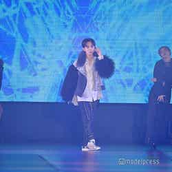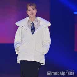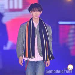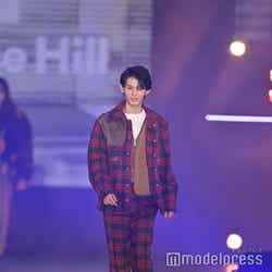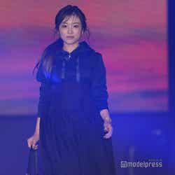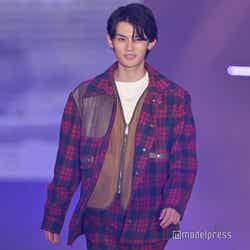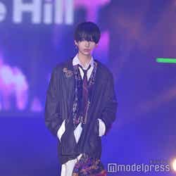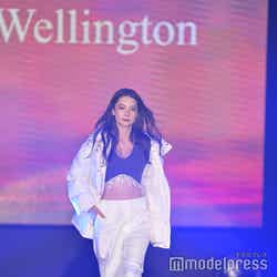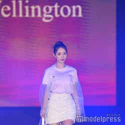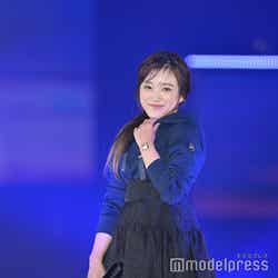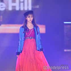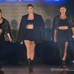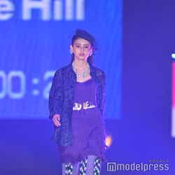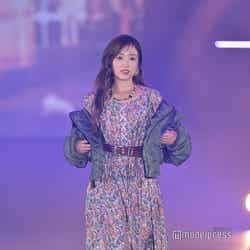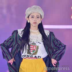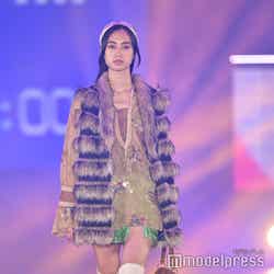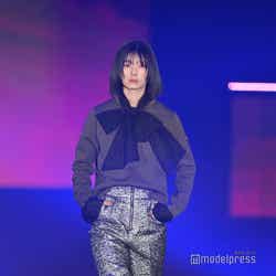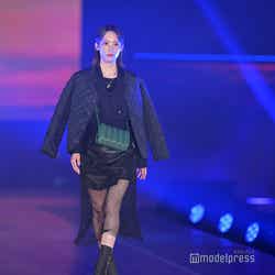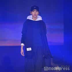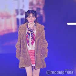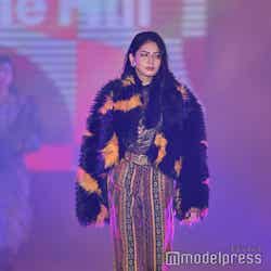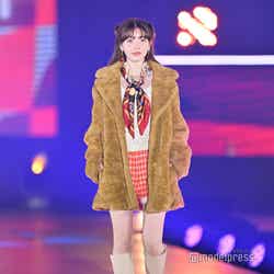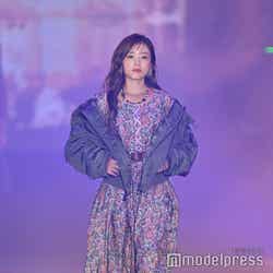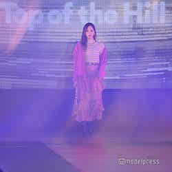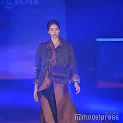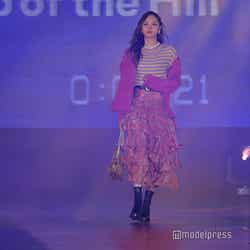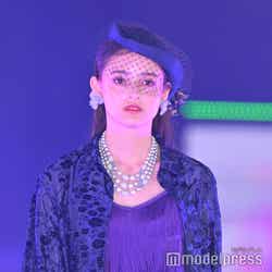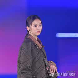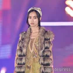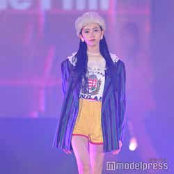梅澤はボーダーのトップスをペイズリー柄のスカートにタックインし、スタイルの良さが際立つコーディネートに身を包んだ。アイラインで目を囲んだメイクと大ぶりのアクセサリーでゴージャスさを演出し、貫禄も感じさせる圧巻のランウェイで観客の視線を惹きつけていた。