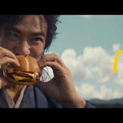 衣装は過去のCMで使用し堺も着慣れている羽織袴であったが、撮影現場では草原の中で長い刀を差したまま走る際の動きづらさを案じる声もあったそう。しかし堺はそんな心配をよそに、抜群の運動神経で颯爽と草原を駆け抜けるアクションを披露。暑さで体力を消耗しないよう椅子やパラソルが用意されても堺は腰を下ろさず、走るルートを何度も駆けながらチェックを繰り返した。長時間に渡る撮影でも疲れを見せず、自身の仕事に万全を期する姿勢に「さすがプロ!」と称賛の拍手が贈られた。