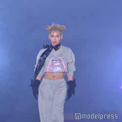 自身がプロデュースを手掛ける「BG」のステージにトップバッターで登場したとうあは、リボンを模した個性的なお団子ヘアでランウェイをウォーキング。クロップド丈のスウェットから引き締まった腹筋をチラ見せし、首元、手袋とリボンを用いたカジュアルかつラブリーなファッションを披露した。