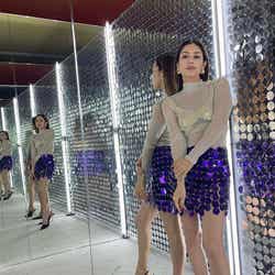 BENIは「mommy’s night out」という言葉を添え、ミニ丈のタンクトップにシースルートップスを重ね、大きな紫のスパンコールが輝くミニ丈のスカートを着こなした写真を投稿した。太ももからつま先までスラリと伸びた美しい脚を大胆に披露し、抜群のスタイルを発揮していた。