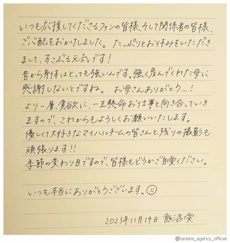 投稿では「飯沼愛に関するご報告」とし、怪我から回復し順次仕事に復帰していることを発表。「この度は関係者の皆様、いつも応援してくださっているファンの皆様にご心配をおかけいたしました」と謝罪した上で「今後とも応援のほど、よろしくお願い申し上げます」と結んでいる。また、飯沼の直筆の手紙も公開。飯沼は「たっぷりとお休みをいただきまして、すこぶる元気です!」とつづり、「昔から身体はとっても強いんです。強く産んでくれた母に感謝しないとですね。お母さんありがとう…!」と母に感謝を寄せた。最後には「より一層、貪欲に、一生懸命お仕事と向き合っていきますので、これからもよろしくお願いいたします。優しくて大好きなマイハルチームの皆さんと残りの撮影も頑張ります!!」と意気込みを記した。